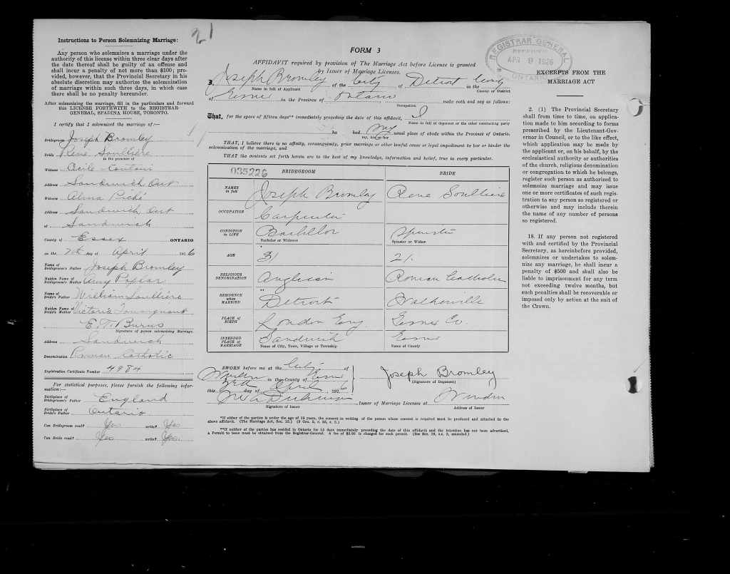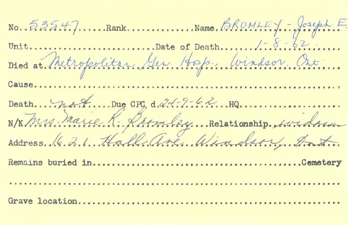 Upon returning to Canada, he was admitted to hospital where he claimed to have been wounded by a bomb and taken prisoner at Armentières on 28 November 1916.114 He had been hospitalised with wounds to his right hand and leg from a grenade according to his German POW file.115 He was approved for a war service gratuity even though soldiers were not to be paid if they had contributed to their own captivity by cowardice or neglect. Therefore, he was either not interviewed or not rigorously interrogated during the twenty-four hour repatriation process at the reception centre in Ripon.116 Bromley moved to Detroit upon demobilisation. He was awarded the Victory Medal and the British War Medal. The latter was returned in July1921. Bromley died August 1962 in Windsor Ontario and his widowr eceived a pension.