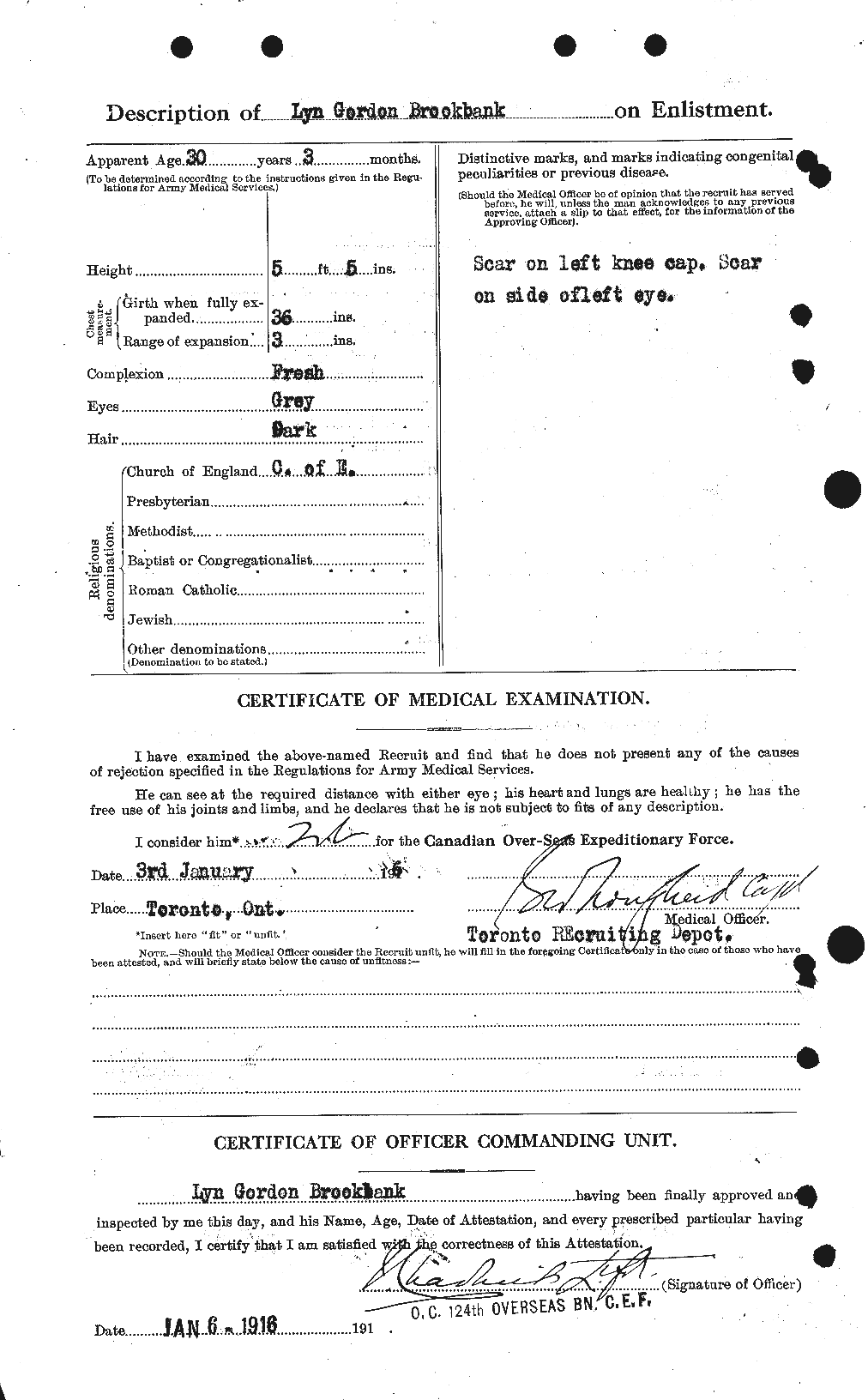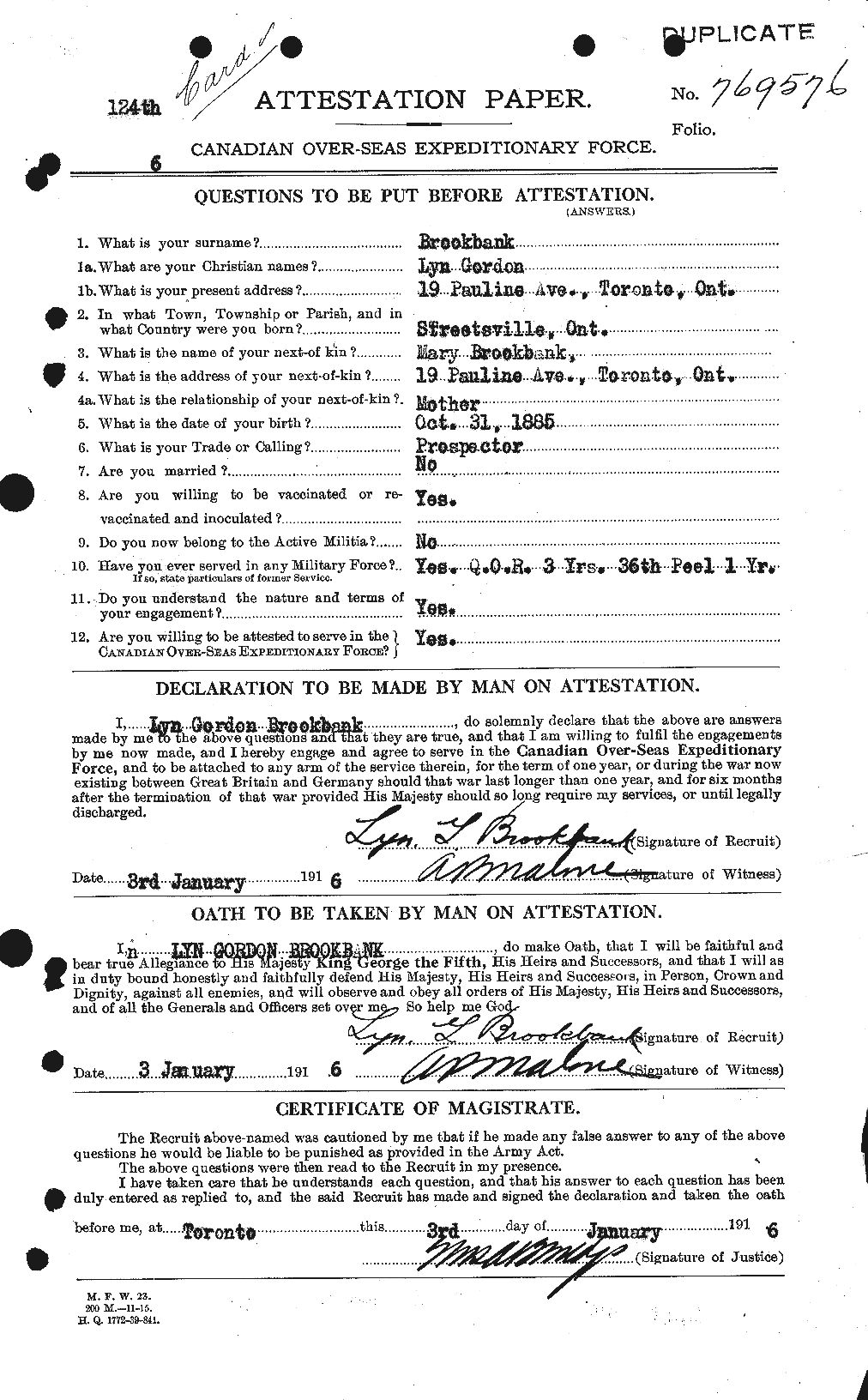 Lyn Gordon Brookbank was born on 31st October 1885 in Streetsville, Ontario, Canada, and having worked as a prospector, and also seen service with the Canadian Militia for three years with the Queen’s Own Rifles of Toronto, and one year with the 36th Peel Battalion of Infantry, with the outbreak of the Great War then enlisted into the Canadian Overseas Expeditionary Force as a Private (No.769576) with the 124th Battalion Canadian Infantry – the Governor General’s Bodyguard, at Toronto on 3rd January 1916.