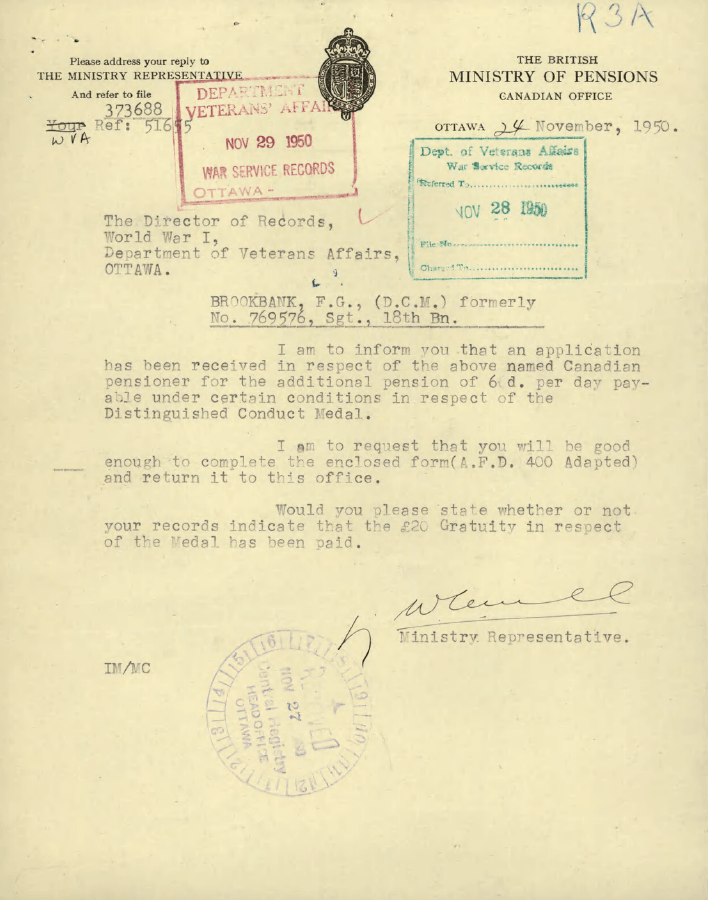 Posted with the 124th Battalion to England in August 1916, the battalion was redesignated the 124th Pioneer Battalion on joining the Canadian Expeditionary Force, and Brookbank, who had been promoted to Sergeant, then found himself transferred to the 18th Western Ontario Battalion, Canadian Infantry, and unit of the 4th Infantry Brigade in the 2nd Canadian Division.