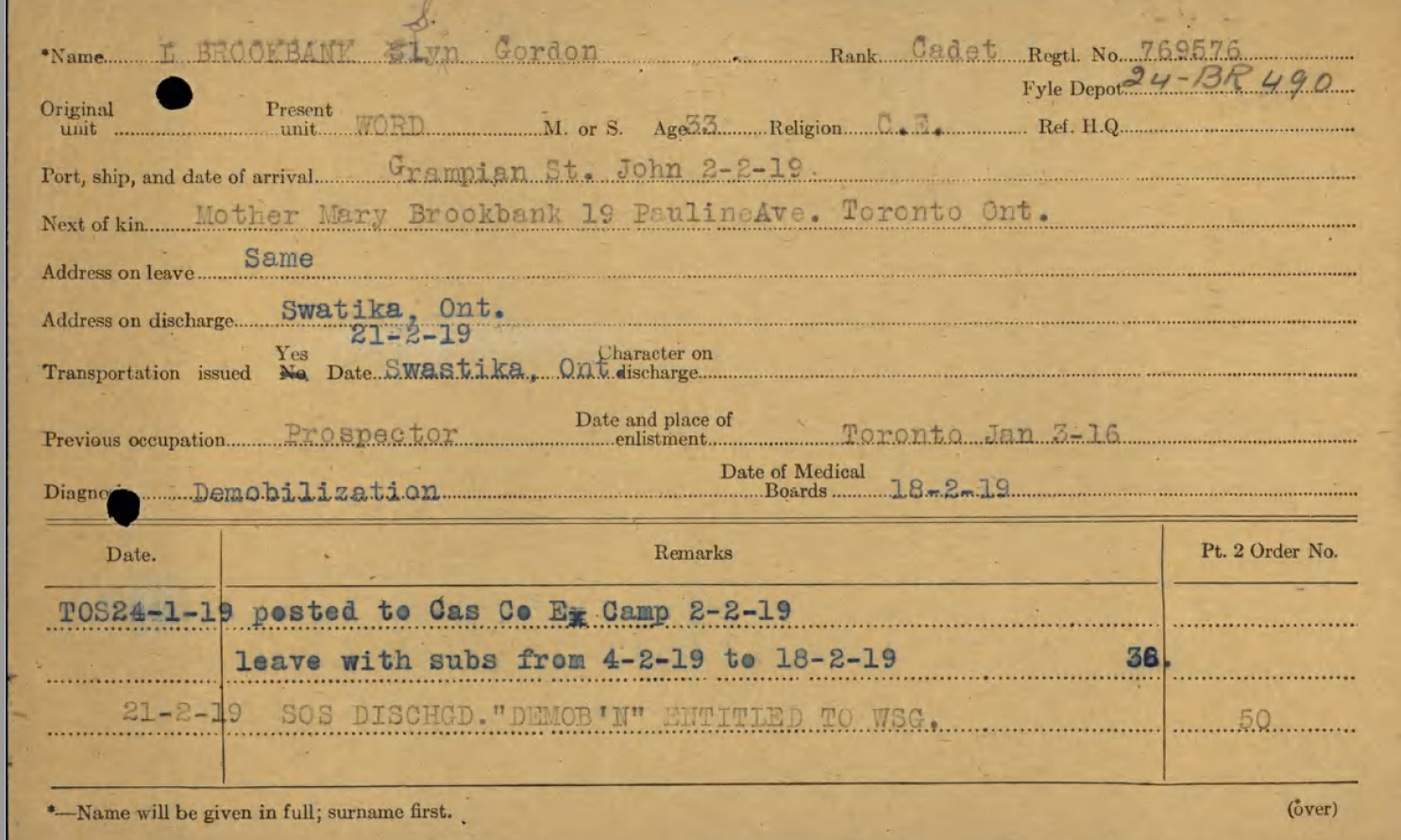 Family Search: When Sergeant Lynford Gordon Brookbank was born on 31 October 1885, in Streetsville, Toronto Township, Peel, Ontario, Canada, his father, Joseph Brookbank, was 32 and his mother, Mary McKenzie, was 21. He lived in Swastika, Timiskaming, Ontario, Canada in 1922 and Timiskaming, Ontario, Canada in 1931. He registered for military service in 1916. In 1916, at the age of 31, his occupation is listed as prospector in Toronto, York, Ontario, Canada. He died on 8 September 1963, in Kirkland Lake, Timiskaming, Ontario, Canada, at the age of 77, and was buried in Kirkland Lake Cemetery, Kirkland Lake, Timiskaming, Ontario, Canada.