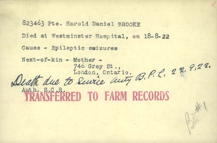 Family Search: When Harry Brooke was born on 4 March 1897, in London, England, United Kingdom, his father, Daniel Dudley Brooke, was 34 and his mother, Fanny Whelen, was 26. He lived in London, Ontario, Canada West, British Colonial America in 1911. He registered for military service in 1916. In 1916, at the age of 19, his occupation is listed as candy maker in London, Ontario, Canada. He died on 18 August 1922, in London, Ontario, Canada, at the age of 25.