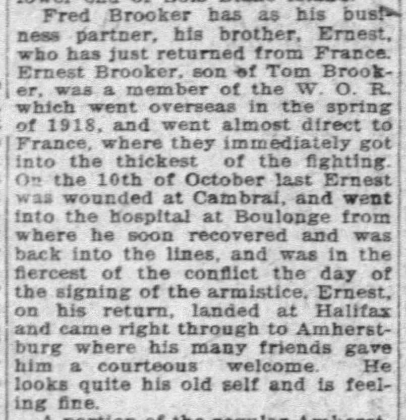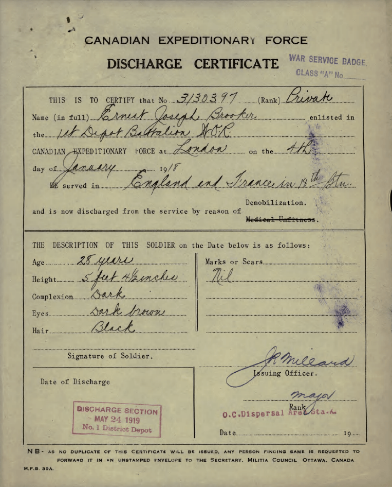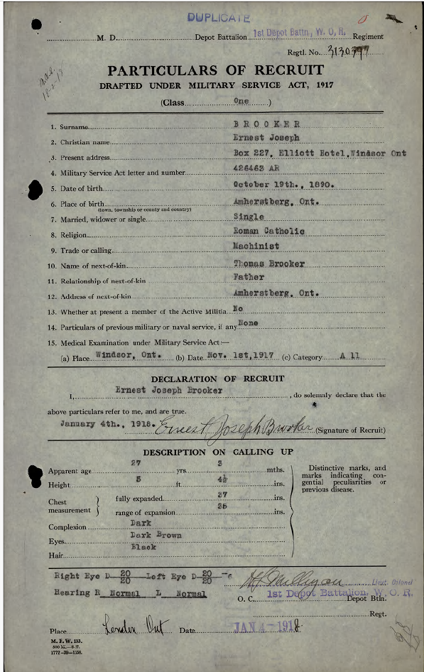 Family Search: When Private Ernest Joseph Brooker was born on 19 October 1890, in Amherstburg, Essex, Ontario, Canada, his father, Thomas Brooker, was 31 and his mother, Marie Emelie Meloche, was 33. He married Marie Eugenie ‘Jennie’ Martin on 14 January 1922, in Windsor, Essex, Ontario, Canada. He lived in Ontario, Canada in 1890 and Essex, Ontario, Canada in 1901. He registered for military service in 1918. In 1918, at the age of 28, his occupation is listed as machinist in Amherstburg, Essex, Ontario, Canada. He died on 22 December 1963, in Windsor, Essex, Ontario, Canada, at the age of 73, and was buried in Assumption Cemetery, Windsor, Essex, Ontario, Canada.