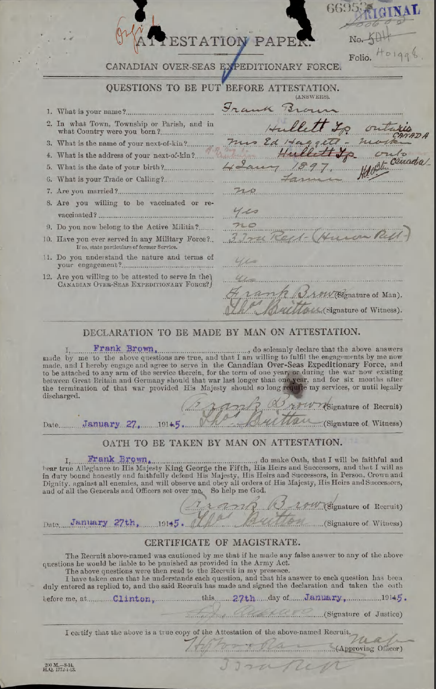 Family Search: When Corporal Francis Robert Brown was born on 4 January 1897, in Hullett Township, Huron, Ontario, Canada, his father, James Brown, was 39 and his mother, Mary Ann Crawford, was 31. He married Evelyn Harriet Brinton in 1924, in Montreal, Quebec, Canada. They were the parents of at least 1 daughter. He lived in Cochrane, Ontario, Canada, for about 9 years. He registered for military service in 1915. He died in 1977, in Southgate Township, Grey, Ontario, Canada, at the age of 80, and was buried in Southgate Township, Grey, Ontario, Canada.