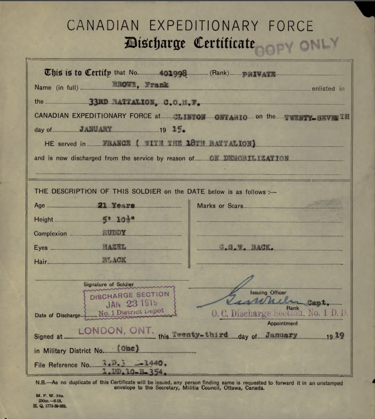 He was Taken on Strength with No. 1 District Depot, London, Ontario, on the same date, and after arriving in London, he was discharged due to demobilization on 23 January 1918.