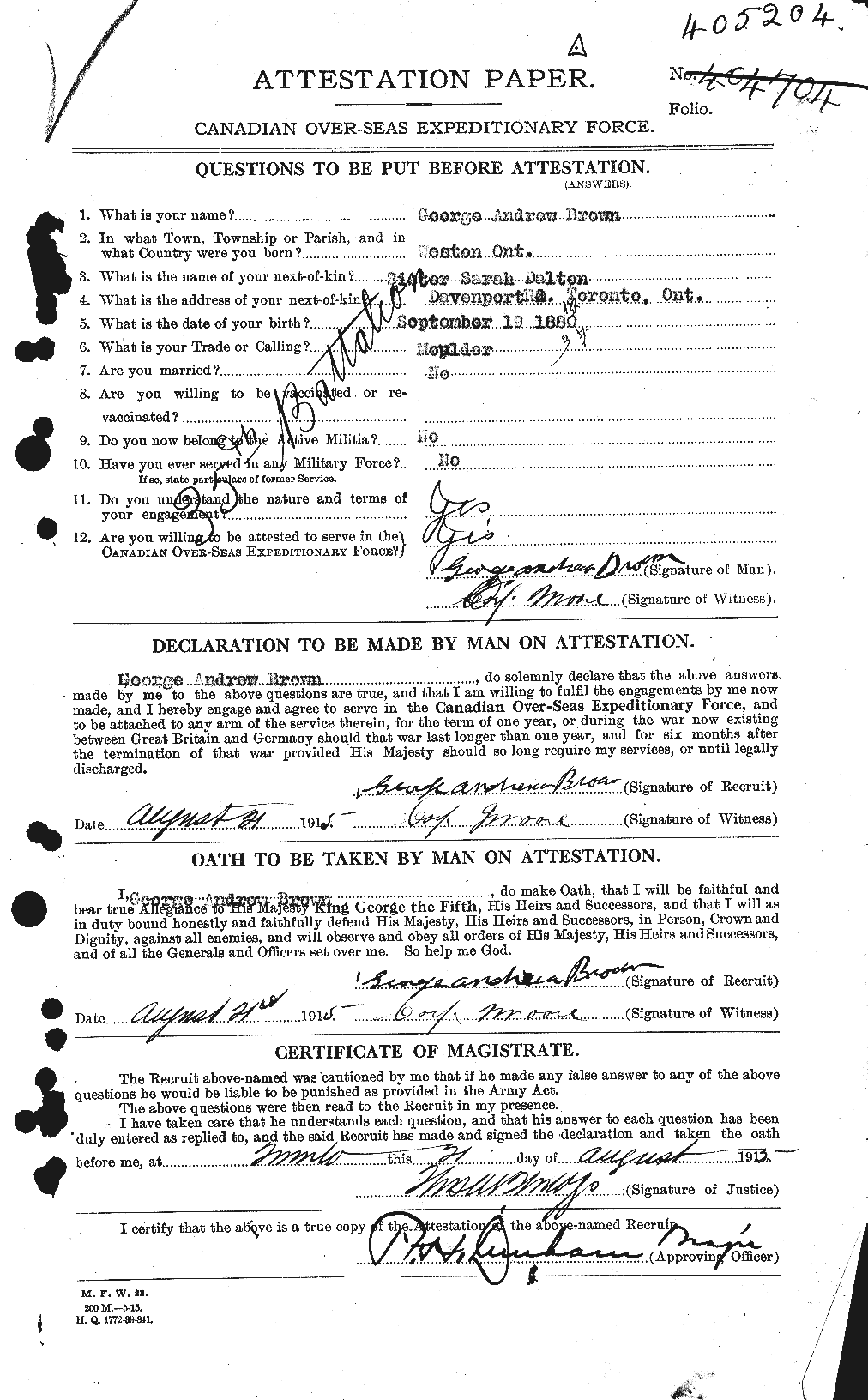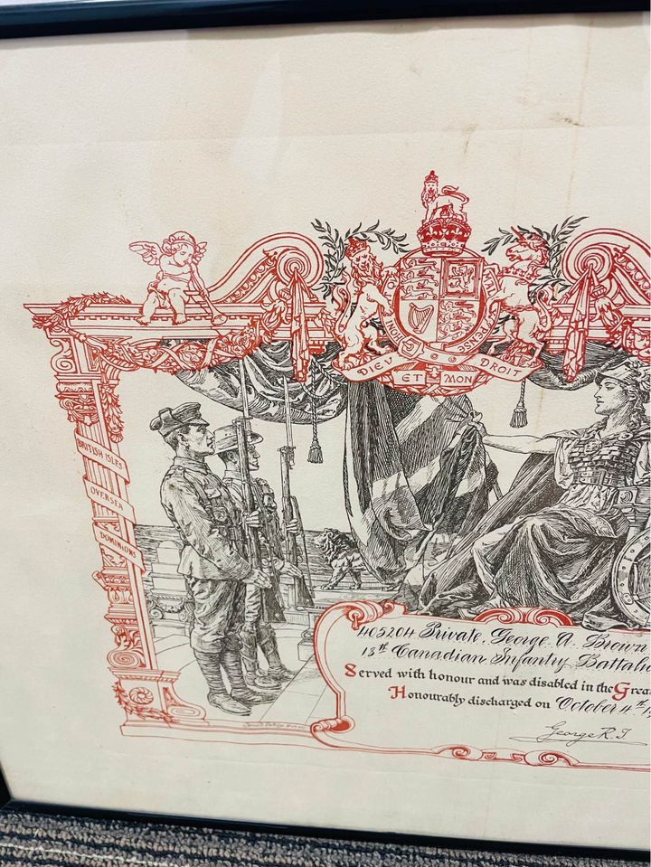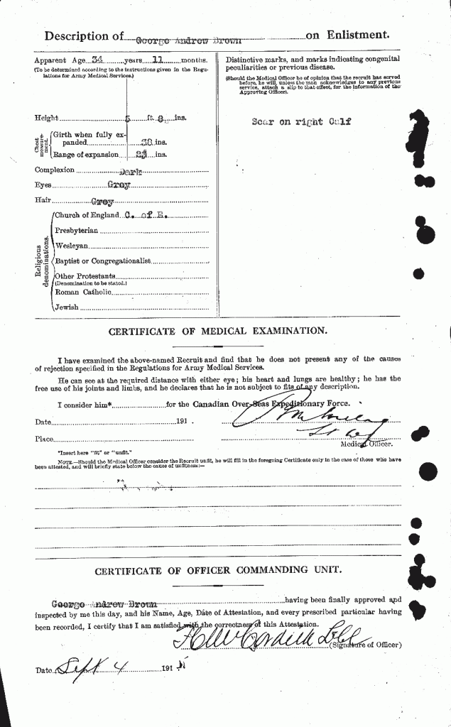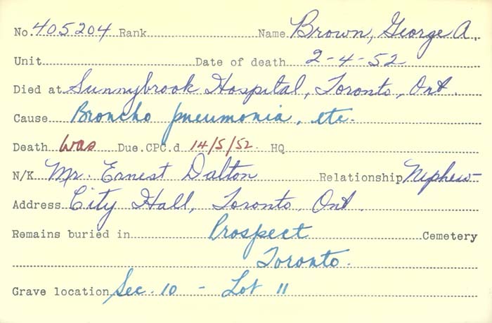 Family Search: When Private George Andrew Richard Brown was born on 19 September 1877, in Weston, Toronto, Ontario, Canada, his father, William O’Connor Brown, was 36 and his mother, Sarah Snider, was 36. He married Maud Mcfarlane on 28 November 1895, in York, Toronto, Ontario, Canada. He lived in York, York, Ontario, Canada in 1881. He registered for military service in 1915. In 1915, at the age of 38, his occupation is listed as moulder in Toronto, York, Ontario, Canada. He died on 2 April 1952, in Toronto, York, Ontario, Canada, at the age of 74, and was buried in Prospect Cemetery, Toronto, Ontario, Canada.