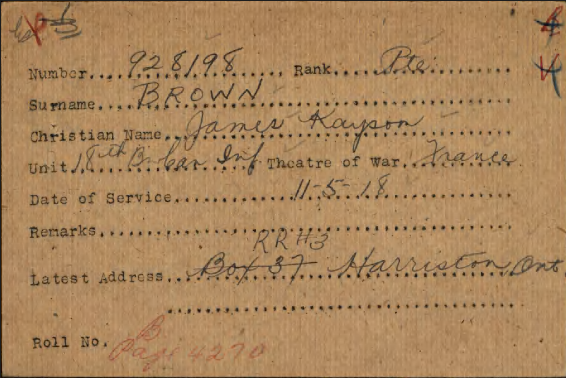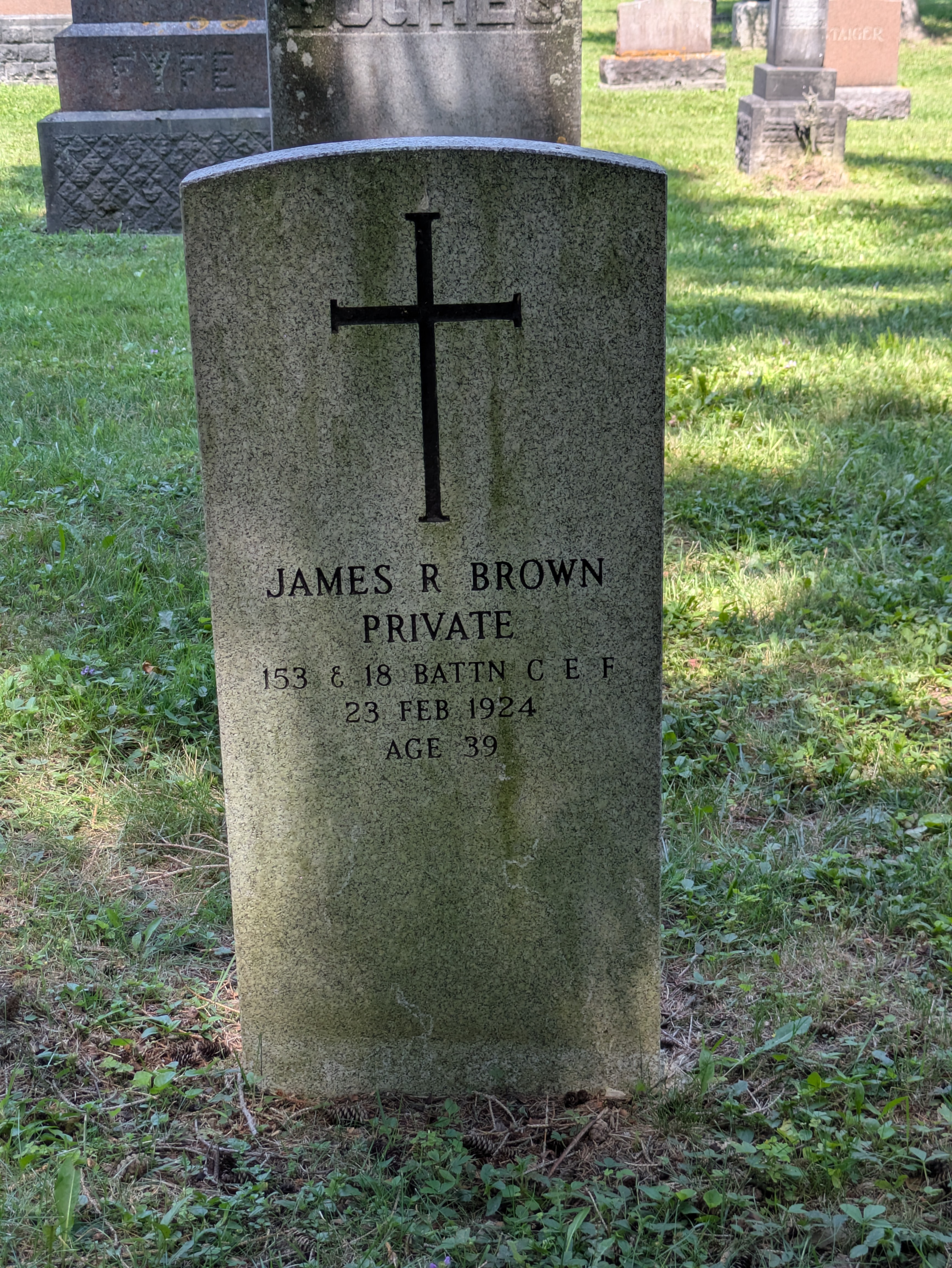 Family Search: Private James Kayson Brown was born on 17 September 1884, in Minto Township, Wellington, Ontario, Canada as the son of Brown and Susan. He lived in Harriston, Wellington, Ontario, Canada in 1921. He registered for military service in 1915. In 1915, at the age of 31, his occupation is listed as farmer in Harriston, Wellington, Ontario, Canada. He died on 23 February 1924, in Ontario, Canada, at the age of 39.