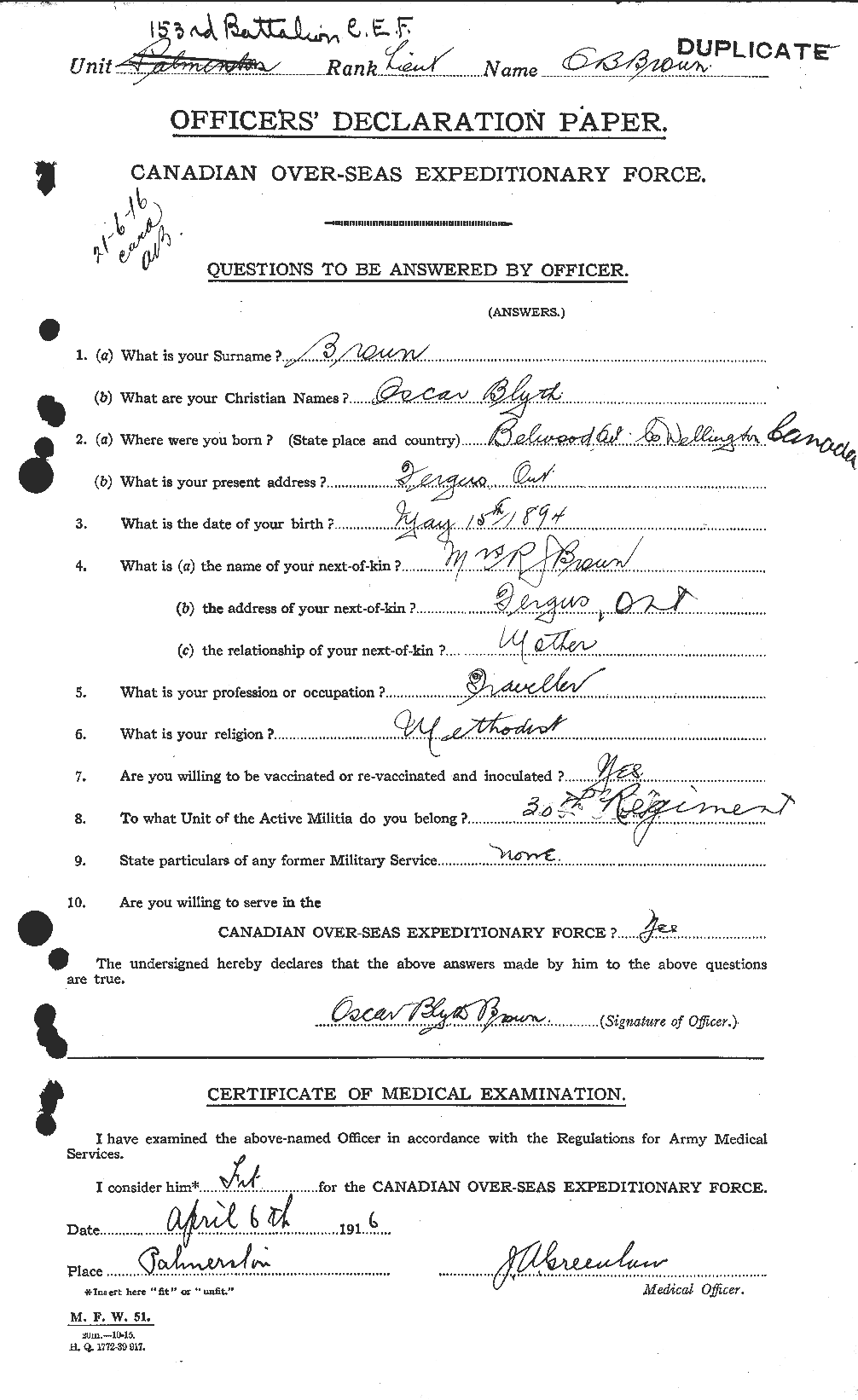 Brown, Oscar Blyth: Lieutenant Digitized Service Records Source: Joined Battalion April 14, 1918 per the War Dairy entry that date. Bio: DEAD LINK Find-A-Grave Brown, Oscar Blyth: Lieutenant. Source: 153rd Battalion. Lieutenant Oscar Blyth Brown Share this: Click to email a link to a friend (Opens in new window) Email Click to share on Facebook (Opens in new window) Facebook Click to share on X (Opens in new window) X Click to share on Reddit (Opens in new window) Reddit Click to share on LinkedIn (Opens in new window) LinkedIn Click to print (Opens in new window) Print Click to share on Tumblr (Opens in new window) Tumblr Click to share on Pocket (Opens in new window) Pocket Click to share on Pinterest (Opens in new window) Pinterest Click to share on Telegram (Opens in new window) Telegram Click to share on WhatsApp (Opens in new window) WhatsApp Like Loading...