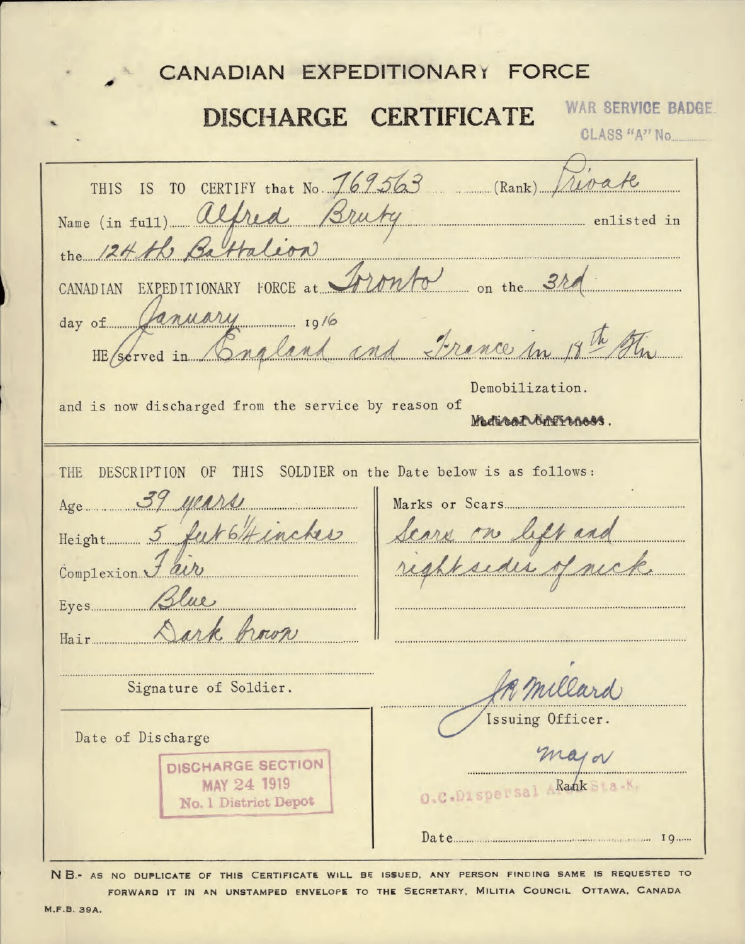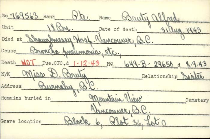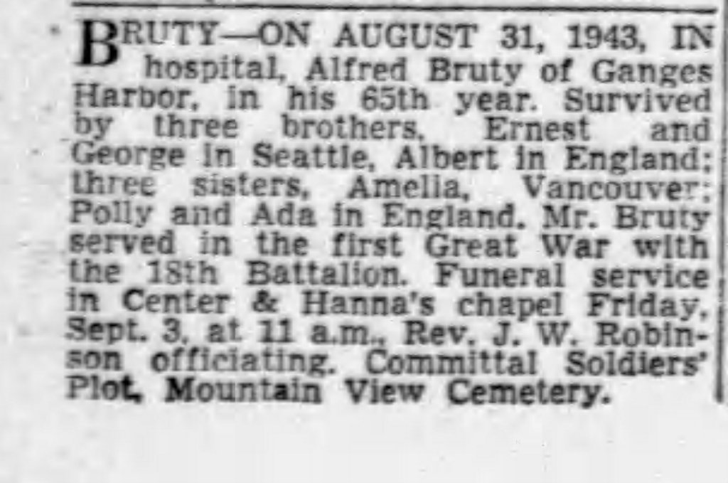 Family Search: When Private Alfred Bruty was born on 30 July 1880, in London, England, United Kingdom, his father, James Bruty, was 53 and his mother, Sarah Ann Evestaff, was 37. He immigrated to Seattle, King, Washington, United States in 1924 and lived in Bethnal Green, London, England, United Kingdom in 1891 and Toronto, York, Ontario, Canada in 1916. He registered for military service in 1916. In 1916, at the age of 36, his occupation is listed as bookbinder in Toronto, York, Ontario, Canada. He died on 31 August 1943, in Vancouver, British Columbia, Canada, at the age of 63, and was buried in Metro Vancouver, British Columbia, Canada.