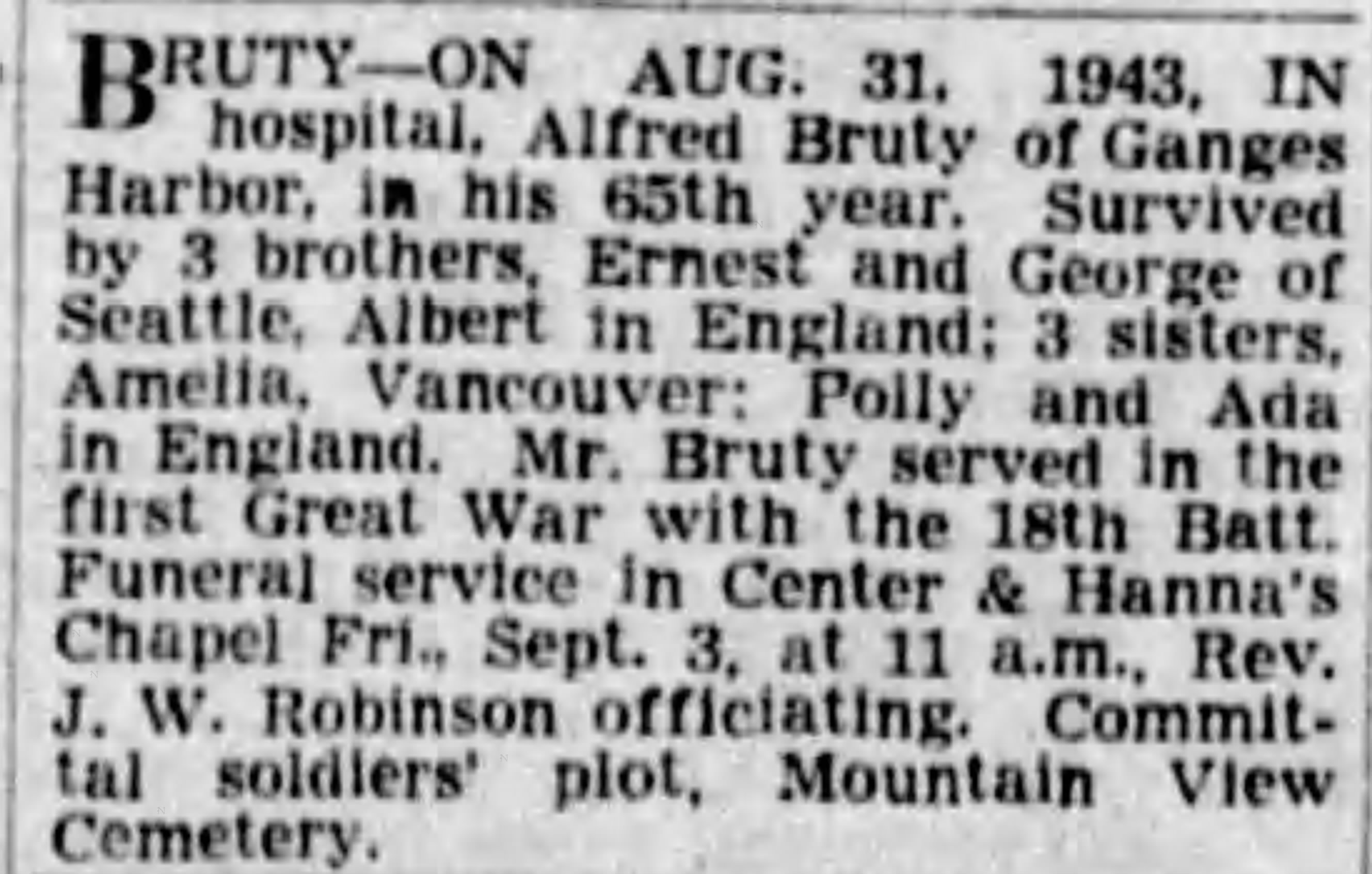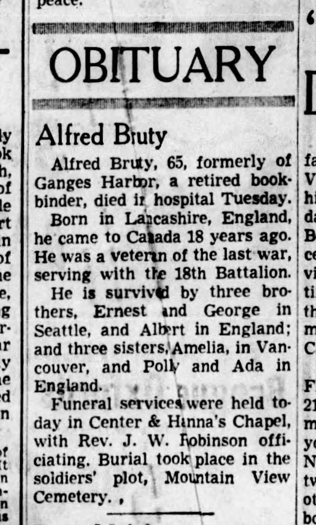 Family Search: When Private Alfred Bruty was born on 30 July 1880, in London, England, United Kingdom, his father, James Bruty, was 53 and his mother, Sarah Ann Evestaff, was 37. He immigrated to Seattle, King, Washington, United States in 1924 and lived in Bethnal Green, London, England, United Kingdom in 1891 and Toronto, York, Ontario, Canada in 1916. He registered for military service in 1916. In 1916, at the age of 36, his occupation is listed as bookbinder in Toronto, York, Ontario, Canada. He died on 31 August 1943, in Vancouver, British Columbia, Canada, at the age of 63, and was buried in Metro Vancouver, British Columbia, Canada.