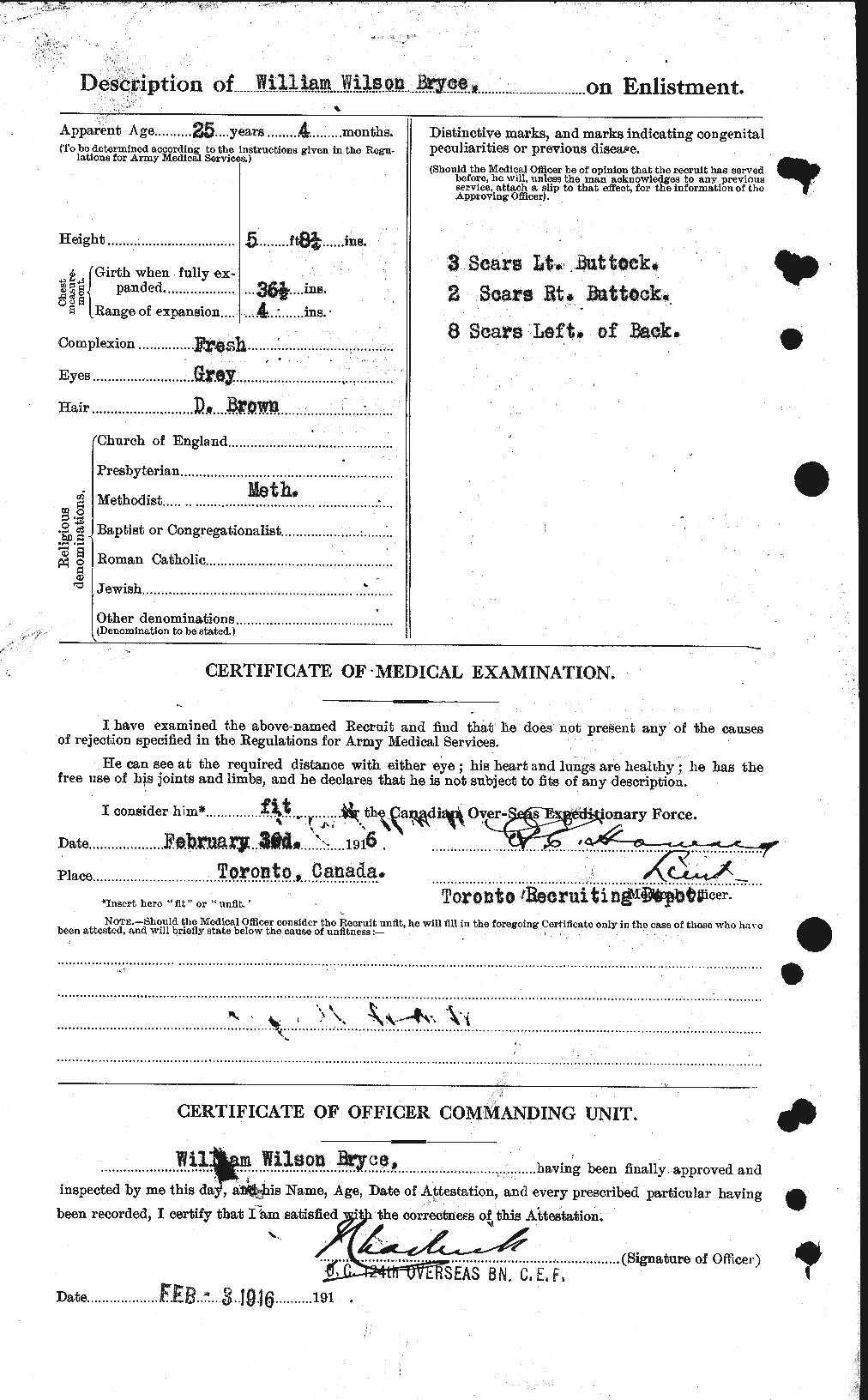 | February 3, 1916 | Enlisted in 124th Battalion. | Enlisted in Toronto, Ontario. Living at 187 University Avenue, Toronto, Ontario. He is single with the trade of carpenter. |