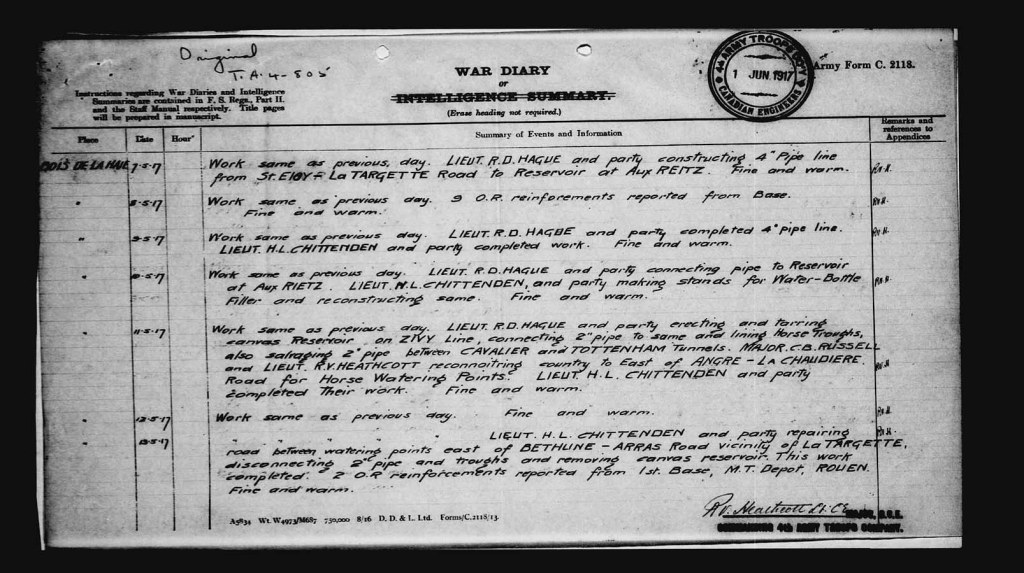 [iv] The 18th Battalion War Diary entry for that date makes no mention of being subject to shelling. “Before day-break Lieut. J. McAmmond, who was in Command of our right Platoon, under great difficulties established communications with the 19th Battalion, both through advance Posts in T.24.c. and along Winnipeg Road (t.23.d.) During a break in communication a Pigeon Message was sent to Brigade Headquarters. Pigeons were released and flew a distance of approximately 6 miles, to ECOIVRES, where they were trapped and message wired to Brigade, the whole proceedings occupying 23 minutes.”