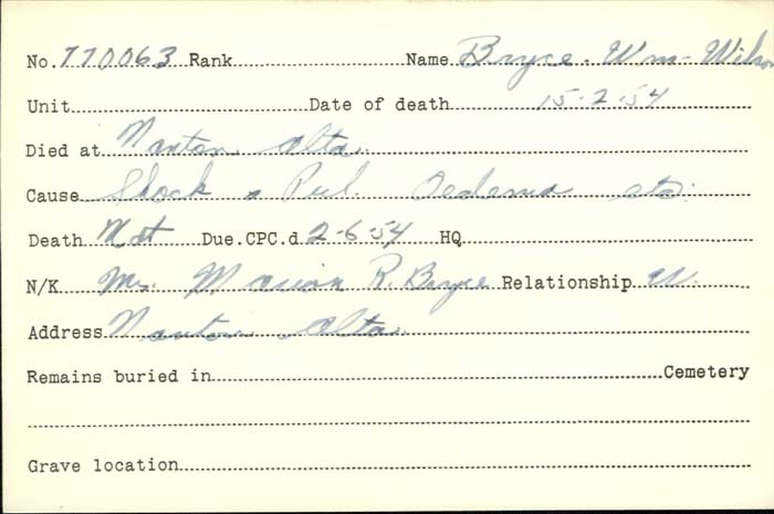 Date of Death: Paisley Headstone – 1968. Nanton Headstone – 1954. Per service records – February 15, 1954. Per obituary February 13, 1954.