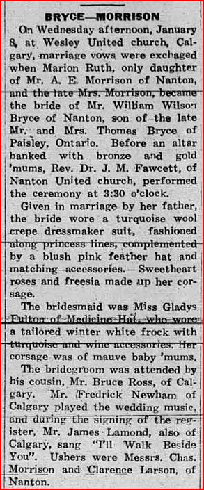 In Calgary on Feb. 13, William Wilson Bryce, aged 61 years, on Nanton. Services by the Rev. Dwight Powell with be held at the United Church at Nanton, Thursday afternoon at 3.30. SNODGRASS Funeral home in charge.Source: Calgary Herald. February 16, 1954. Via Thomas Brown.