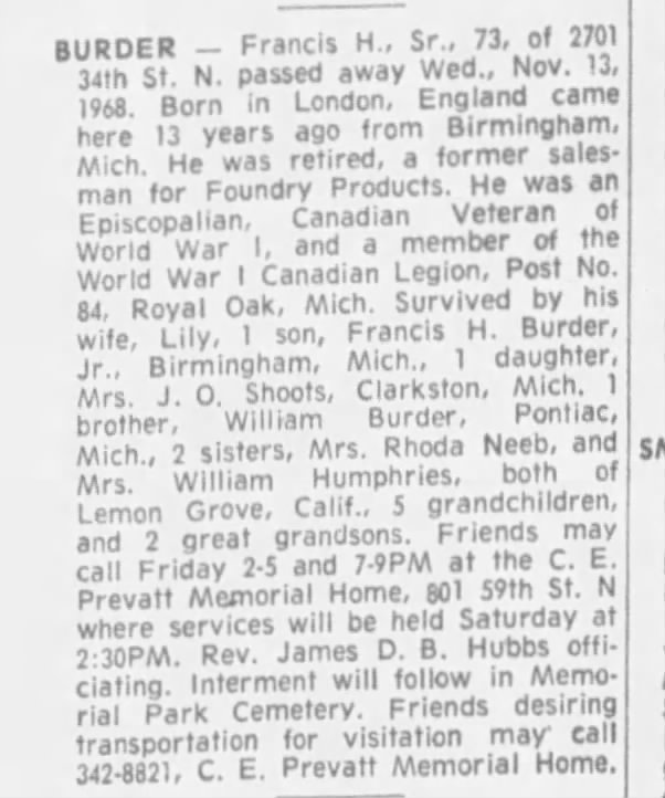 Family Search: Francis Henry “Frank” Burder was born on 10 January 1895, in England, United Kingdom as the son of Henry Burder and Elizabeth Darby. He married Lillie Emily Moore on 16 December 1915, in Oshawa, Ontario, Canada West, British Colonial America. They were the parents of at least 1 son and 3 daughters. He lived in Pontiac, Oakland, Michigan, United States in 1922 and Pontiac Township, Oakland, Michigan, United States in 1930. He registered for military service in 1916. In 1916, at the age of 21, his occupation is listed as coremaker in Oshawa, Ontario, Ontario, Canada.