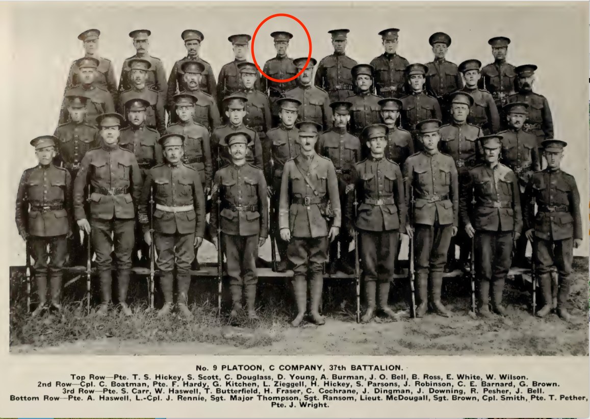 This man enlisted with the 37th Battalion on 22 June 1915 at Camp Niagara, Niagara-on-the-Lake. He was a chairmaker by trade and had 3 years of militia experience with the 31st Regiment.