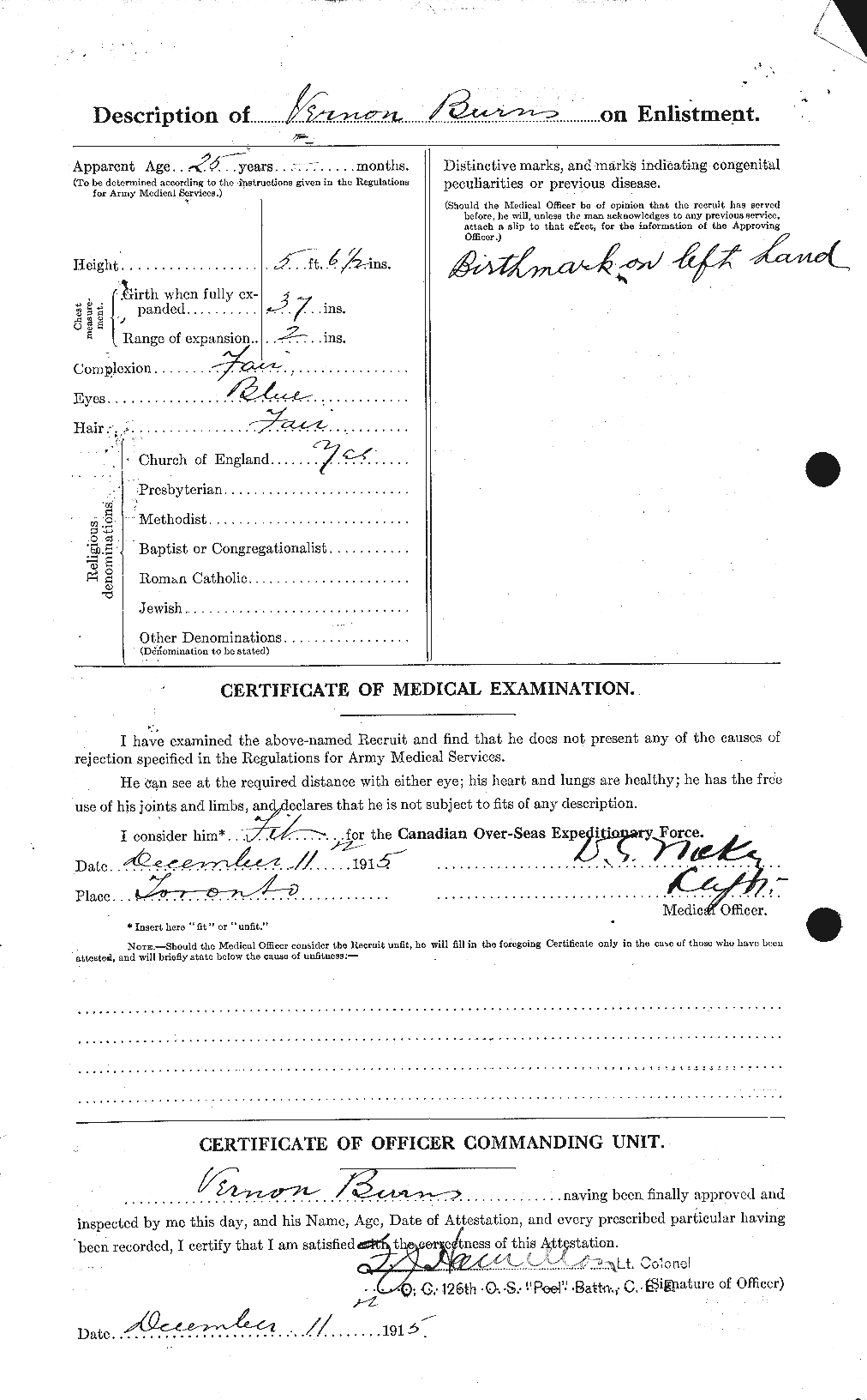 | December 15, 1915 | Enlisted | Enlisted with the 126th Overseas Battalion at Toronto, Ontario. He was a carpenter standing 5.6.5” tall. He had a fair complexion, blue eyes, and fair hair. He was a member of the Church of England and lived at Port Credit. No prior military experience. He is 175 lbs. and has a 35” chest with 3” expansion. His next-of-kin is Mrs. Helen Burns, mother. |