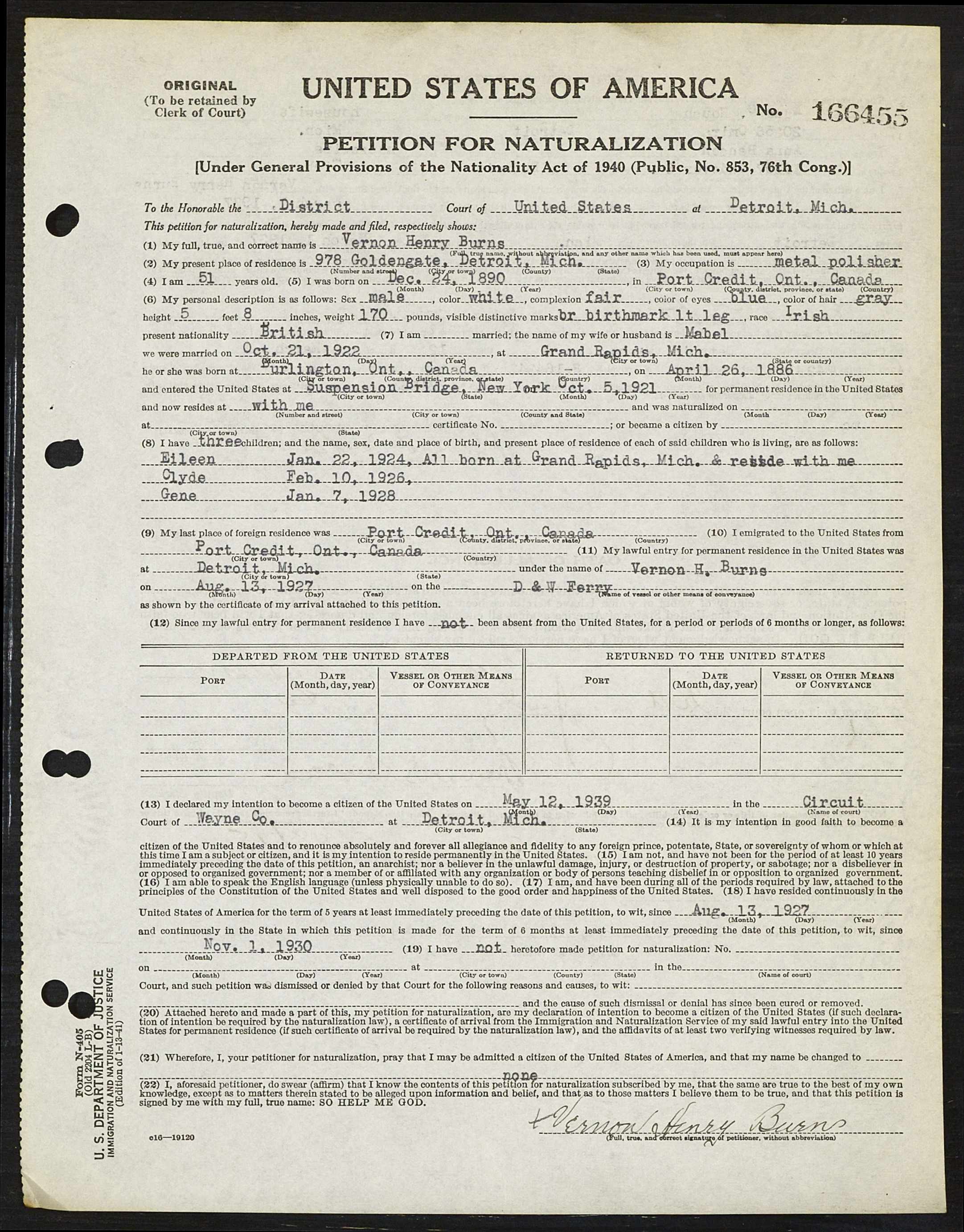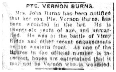 Family Search: When Private Vernon Henry Burns was born on 24 December 1890, in Port Credit, Toronto Township, Peel, Ontario, Canada, his father, John A Burns, was 25 and his mother, Ellen Hogan, was 27. He married Mabel Long on 21 October 1922, in Grand Rapids, Kent, Michigan, United States. They were the parents of at least 5 sons and 3 daughters. He immigrated to Detroit, Wayne, Michigan, United States in 1927 and lived in Detroit, Wayne, Michigan, United States in 1930 and Detroit Ward 9, Detroit, Wayne, Michigan, United States in 1940. He registered for military service in 1915. In 1915, at the age of 25, his occupation is listed as carpenter in Port Credit, Toronto Township, Peel, Ontario, Canada. He died on 9 December 1966, in Belding, Ionia, Michigan, United States, at the age of 75, and was buried in Greene Cemetery, Belding, Ionia, Michigan, United States.