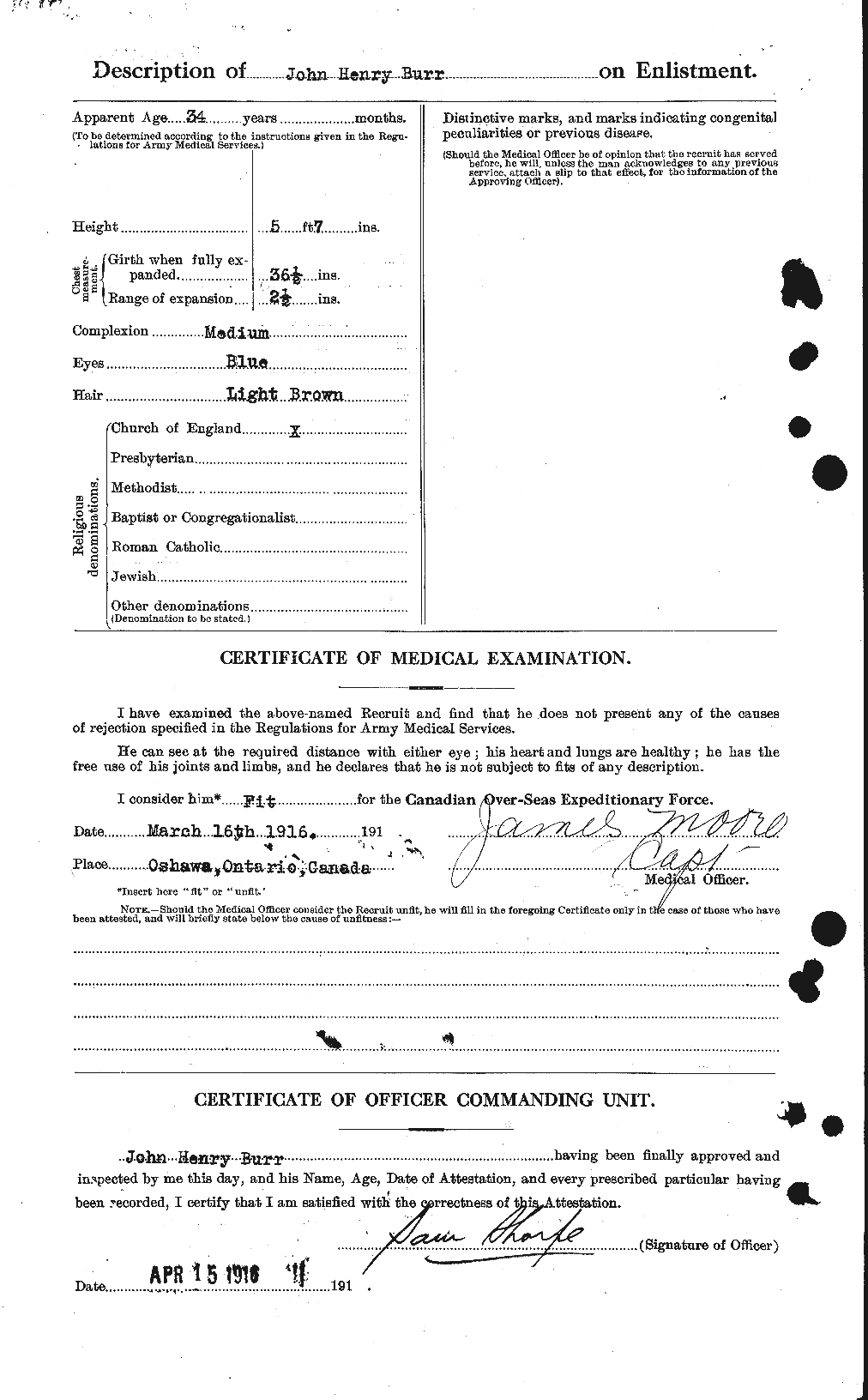Family Search: When Private John Henry Burr was born on 18 February 1882, in Teynham, Kent, England, United Kingdom, his father, Henry Daniel Burr, was 29 and his mother, Mary Caroline Heathfield, was 25. He married Emma Elizabeth Wallis on 3 August 1903, in Rainham, Kent, England, United Kingdom. They were the parents of at least 3 sons and 1 daughter. He immigrated to Canada in 1911 and lived in Rainham, Kent, England, United Kingdom for about 10 years. He registered for military service in 1916. In 1916, at the age of 34, his occupation is listed as moulder in Oshawa, Ontario, Ontario, Canada. He died on 6 April 1959, at the age of 77.