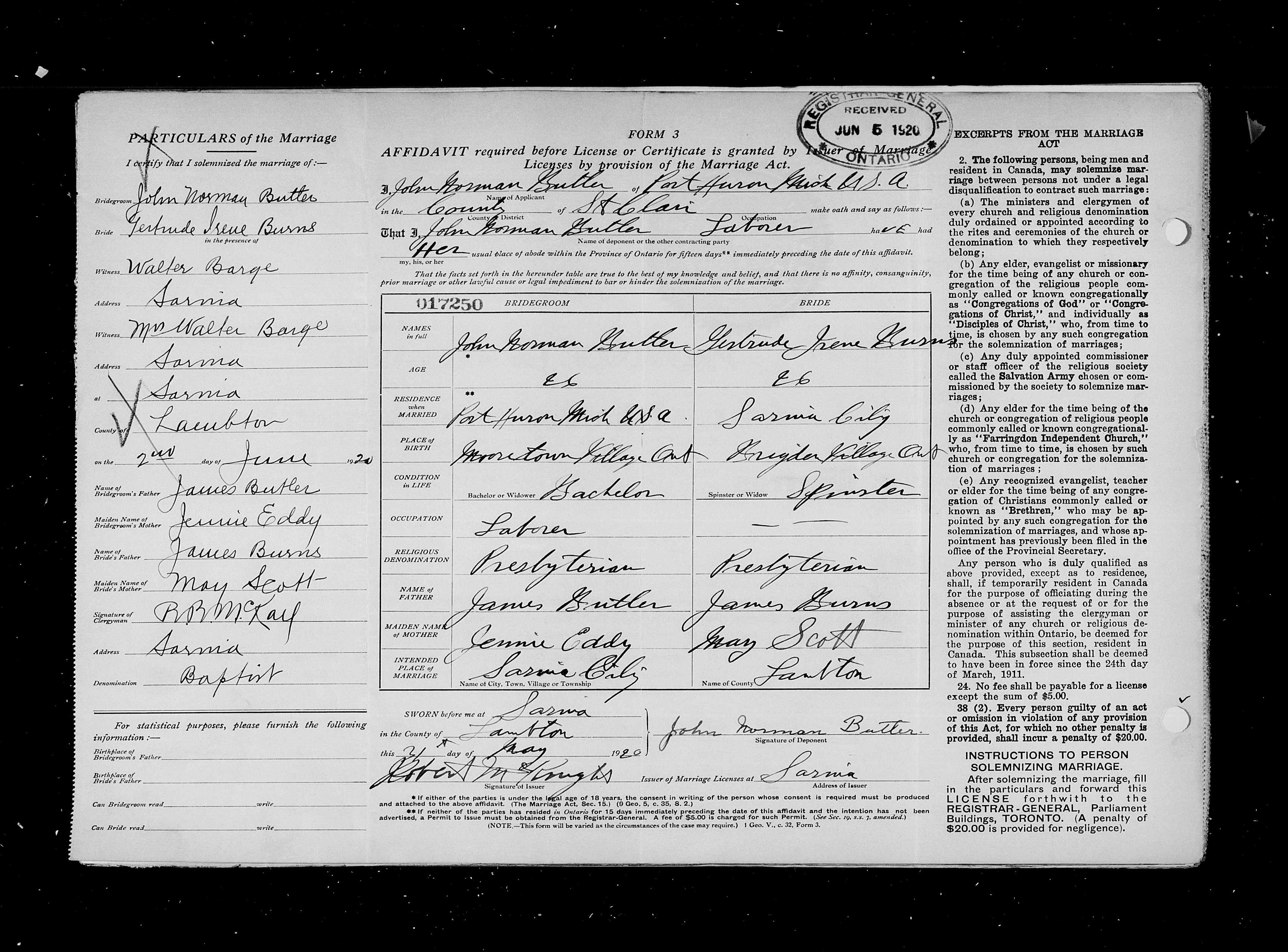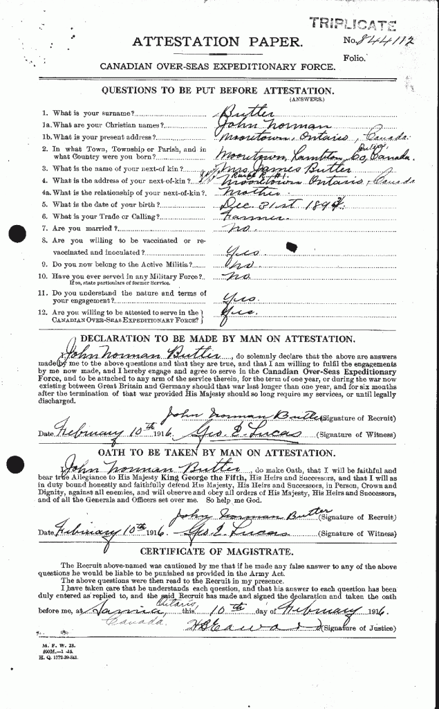 Family Search: When John Norman Butler was born on 31 December 1893, in Moore, Lambton, Ontario, Canada, his father, James Butler, was 43 and his mother, Henrietta Eddy, was 21. He married Gertrude Irene Burns on 31 May 1920, in Ontario, Ontario, Canada. They were the parents of at least 1 daughter. He lived in Mooretown, St. Clair, Lambton, Ontario, Canada in 1916 and Marysville, St. Clair, Michigan, United States in 1923. He registered for military service in 1916. In 1916, at the age of 23, his occupation is listed as farmer in Mooretown, St. Clair, Lambton, Ontario, Canada. He died on 8 March 1975, in Trenton, Wayne, Michigan, United States, at the age of 81, and was buried in Petoskey, Emmet, Michigan, United States.