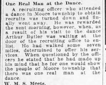 A recruiting officer who attended a dance in Moore township to obtain recruits was turned down and finally went away. He was rewarded the next morning, however, when, as a result of his visit to the dance Arthur Butler was waiting at the door of the recruiting office to enlist. He had walked some seven miles, determined to offer his services. When questioned by the officers he stated that he had made up his mind that he for one would show the people of Moore township that there was one real man at the dance.