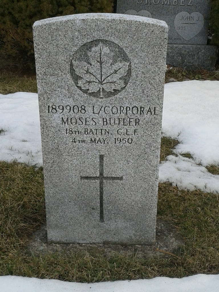Family Search: Lance-Corporal Moses Butler was born on 27 November 1878, in Darlaston, West Midlands, England, United Kingdom. He had at least 2 sons and 2 daughters with Emily Karn. He immigrated to Quebec City, Quebec, Canada in 1911 and lived in Aston, Warwickshire, England, United Kingdom in 1911. He died on 4 May 1950, in Blenheim, Chatham-Kent, Ontario, Canada, at the age of 71, and was buried in Evergreen Cemetery, Blenheim, Chatham-Kent, Ontario, Canada.