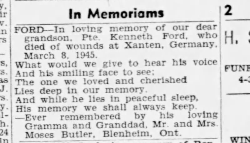Family Search: Lance-Corporal Moses Butler was born on 27 November 1878, in Darlaston, West Midlands, England, United Kingdom. He had at least 2 sons and 2 daughters with Emily Karn. He immigrated to Quebec City, Quebec, Canada in 1911 and lived in Aston, Warwickshire, England, United Kingdom in 1911. He died on 4 May 1950, in Blenheim, Chatham-Kent, Ontario, Canada, at the age of 71, and was buried in Evergreen Cemetery, Blenheim, Chatham-Kent, Ontario, Canada.