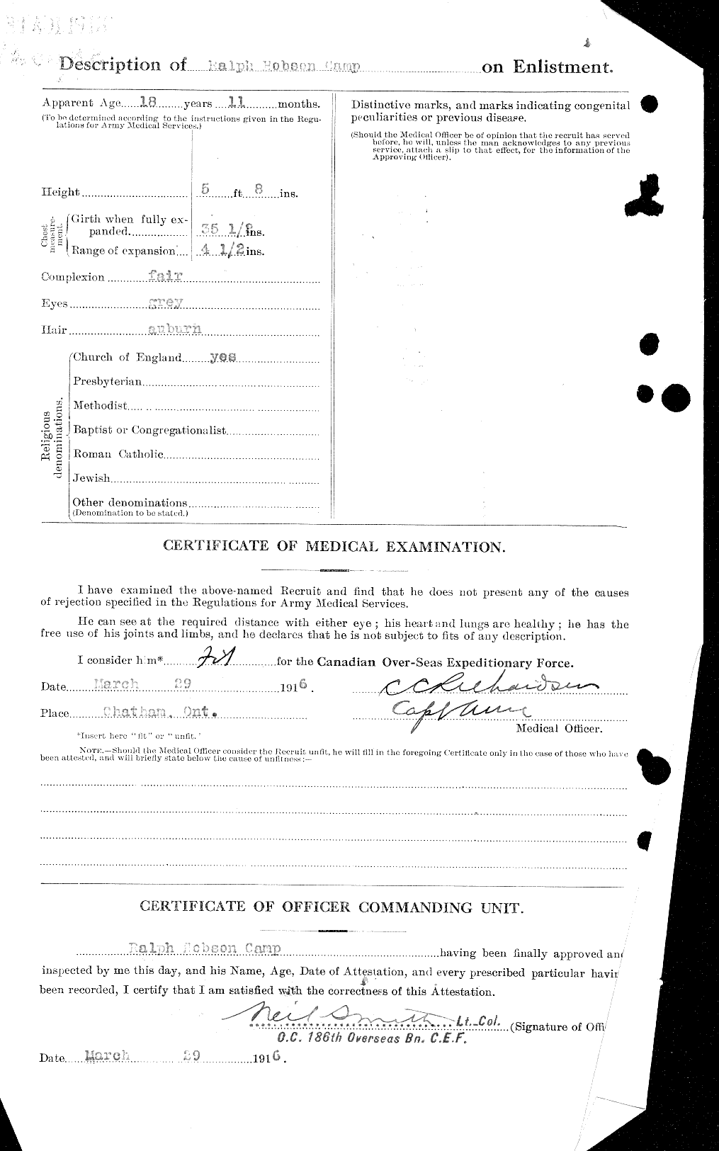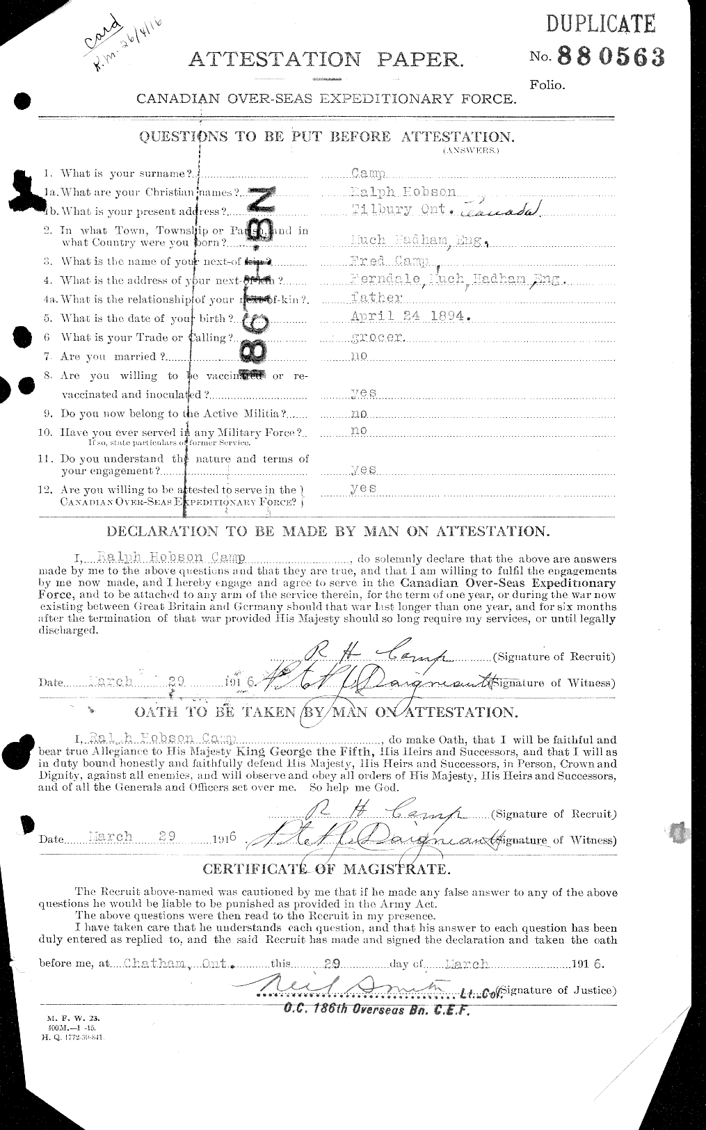 Family Search: When Private Ralph Hobson Camp was born on 24 April 1894, in Much Hadham, Hertfordshire, England, United Kingdom, his father, Frederick Charles Camp, was 35 and his mother, Emily Snow, was 37. He married Clara Saville on 1 May 1917, in Stoke Newington, London, England, United Kingdom. They were the parents of at least 1 son. He immigrated to Quebec City, Quebec, Canada in 1913 and lived in Tilbury, Kent, Ontario, Canada in 1916 and London, Ontario, Canada in 1931. He registered for military service in 1916. In 1916, at the age of 22, his occupation is listed as grocer in Tilbury, Kent, Ontario, Canada. He died in November 1977, in London Township, Middlesex, Ontario, Canada, at the age of 83, and was buried in London Township, Middlesex, Ontario, Canada.