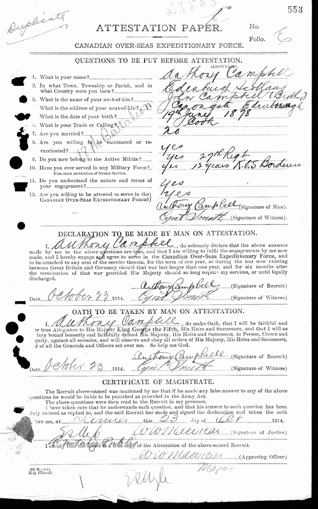 Campbell, Anthony: Service no. 53553 Digitized Service Record Source: 18th Battalion Association memory regarding first Christmas in Front Lines. Searching for “old Davy Campbell”. Find-A-Grave Share this: Click to email a link to a friend (Opens in new window) Email Click to share on Facebook (Opens in new window) Facebook Click to share on X (Opens in new window) X Click to share on Reddit (Opens in new window) Reddit Click to share on LinkedIn (Opens in new window) LinkedIn Click to print (Opens in new window) Print Click to share on Tumblr (Opens in new window) Tumblr Click to share on Pocket (Opens in new window) Pocket Click to share on Pinterest (Opens in new window) Pinterest Click to share on Telegram (Opens in new window) Telegram Click to share on WhatsApp (Opens in new window) WhatsApp Like Loading...
