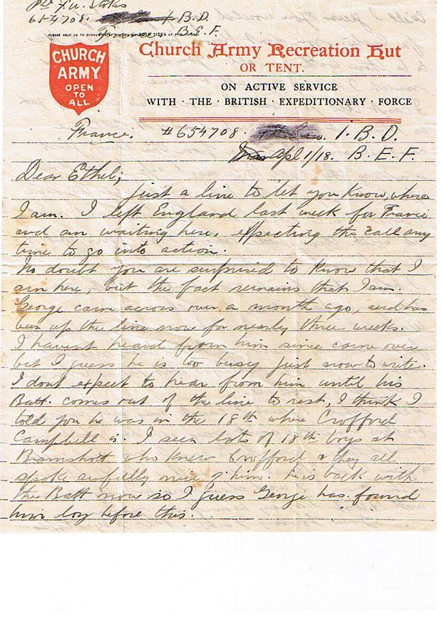 George came across over a month ago, and has been up the line now for nearly three weeks. I haven’t heard from him since came over but I guess he is too busy just now to write. I don’t expect to hear from him until his Batt. Comes out of the line to rest, I think I told you he was in the 18th where Crofford Campbell is. I seen lots of the 18th boys at Bramshott who knew Crofford and they all spoke awfully nice of him. He is back with the Batt now so I guess George has found him long before this.
