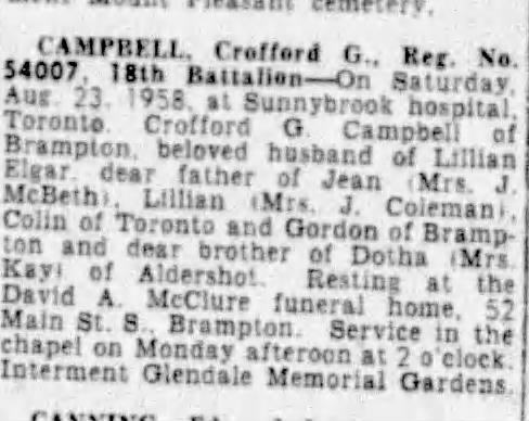 | August 23, 1958 | Deceased | He died at Sunnybrook Hospital. His wife was Lillian V. Campbell and they resided at 147 Mill Street, South, Brampton, Ontario. |