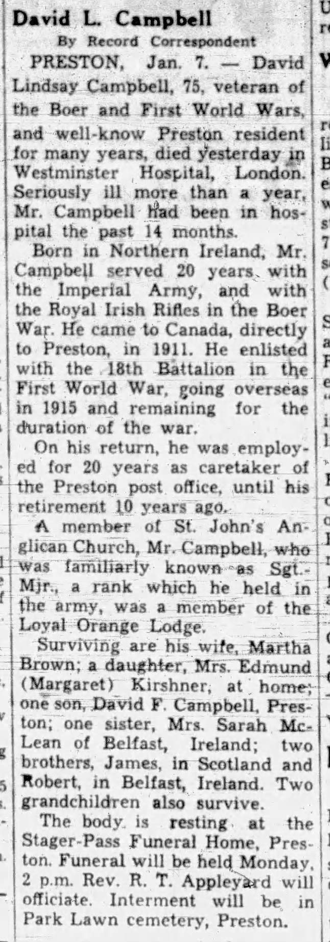 Family Search: Company Sergeant Major David Lindsay Campbell was born on 8 October 1875, in Newtownards, County Down, Ireland. He had at least 1 son and 1 daughter with Martha Brown. He immigrated to Canada in 1912 and lived in Preston, Waterloo, Ontario, Canada in 1931. He registered for military service in 1914. In 1920, his occupation is listed as caretaker, preston post office in Preston, Waterloo, Ontario, Canada. He died on 6 January 1950, in London, Ontario, Canada, at the age of 74, and was buried in Parklawn Cemetery, Cambridge, Waterloo, Ontario, Canada.