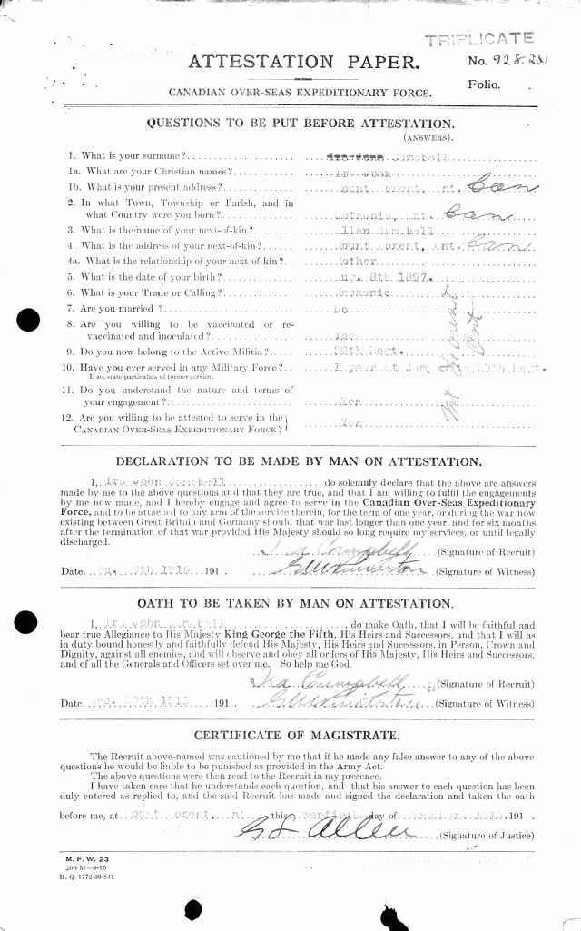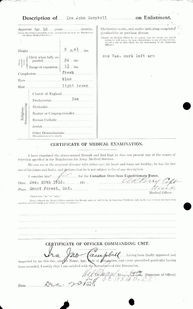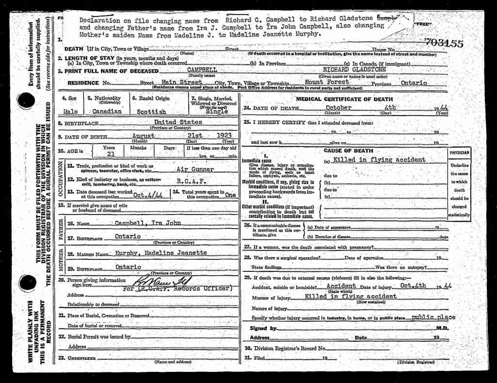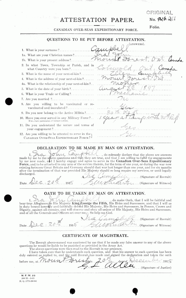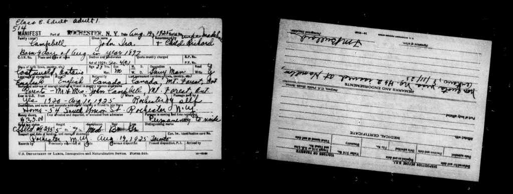 Family Search: When John Ira Campbell was born on 8 August 1897, in Cotswold, Minto, Wellington, Ontario, Canada, his father, John Campbell, was 32 and his mother, Sarah Ellen Bolton, was 27. He married Madeline Jeannette Murphy on 10 January 1923, in Mount Forest, Wellington North, Wellington, Ontario, Canada. They were the parents of at least 1 son and 1 daughter. He lived in Wellington, Ontario, Canada for about 10 years and Mount Forest, Grey, Ontario, Canada in 1915. He registered for military service in 1915. In 1915, at the age of 18, his occupation is listed as mechanic in Mount Forest, Grey, Ontario, Canada. He died on 28 December 1931, in Rochester, Monroe, New York, United States, at the age of 34, and was buried in Mount Forest Cemetery, Southgate, Grey, Ontario, Canada.