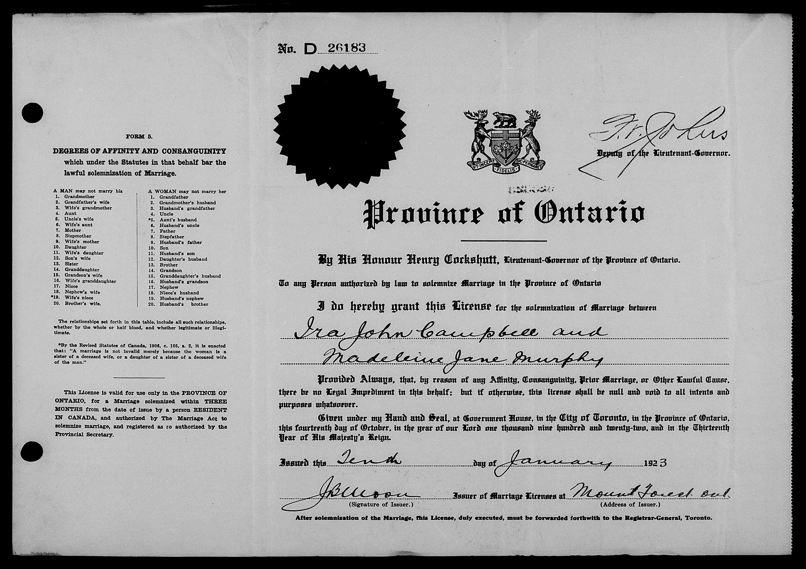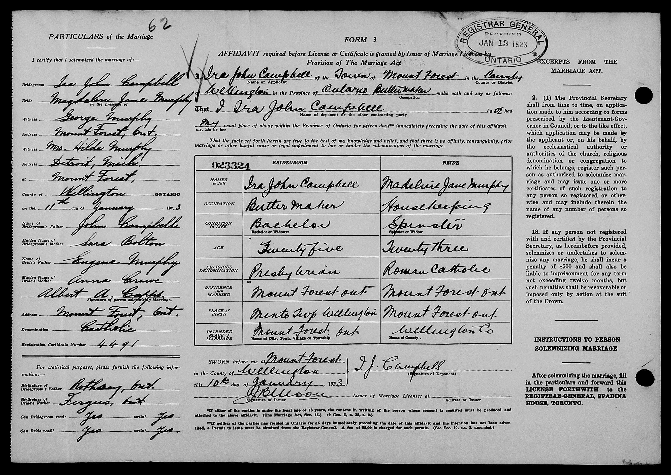 Family Search: When John Ira Campbell was born on 8 August 1897, in Cotswold, Minto, Wellington, Ontario, Canada, his father, John Campbell, was 32 and his mother, Sarah Ellen Bolton, was 27. He married Madeline Jeannette Murphy on 10 January 1923, in Mount Forest, Wellington North, Wellington, Ontario, Canada. They were the parents of at least 1 son and 1 daughter. He lived in Wellington, Ontario, Canada for about 10 years and Mount Forest, Grey, Ontario, Canada in 1915. He registered for military service in 1915. In 1915, at the age of 18, his occupation is listed as mechanic in Mount Forest, Grey, Ontario, Canada. He died on 28 December 1931, in Rochester, Monroe, New York, United States, at the age of 34, and was buried in Mount Forest Cemetery, Southgate, Grey, Ontario, Canada.