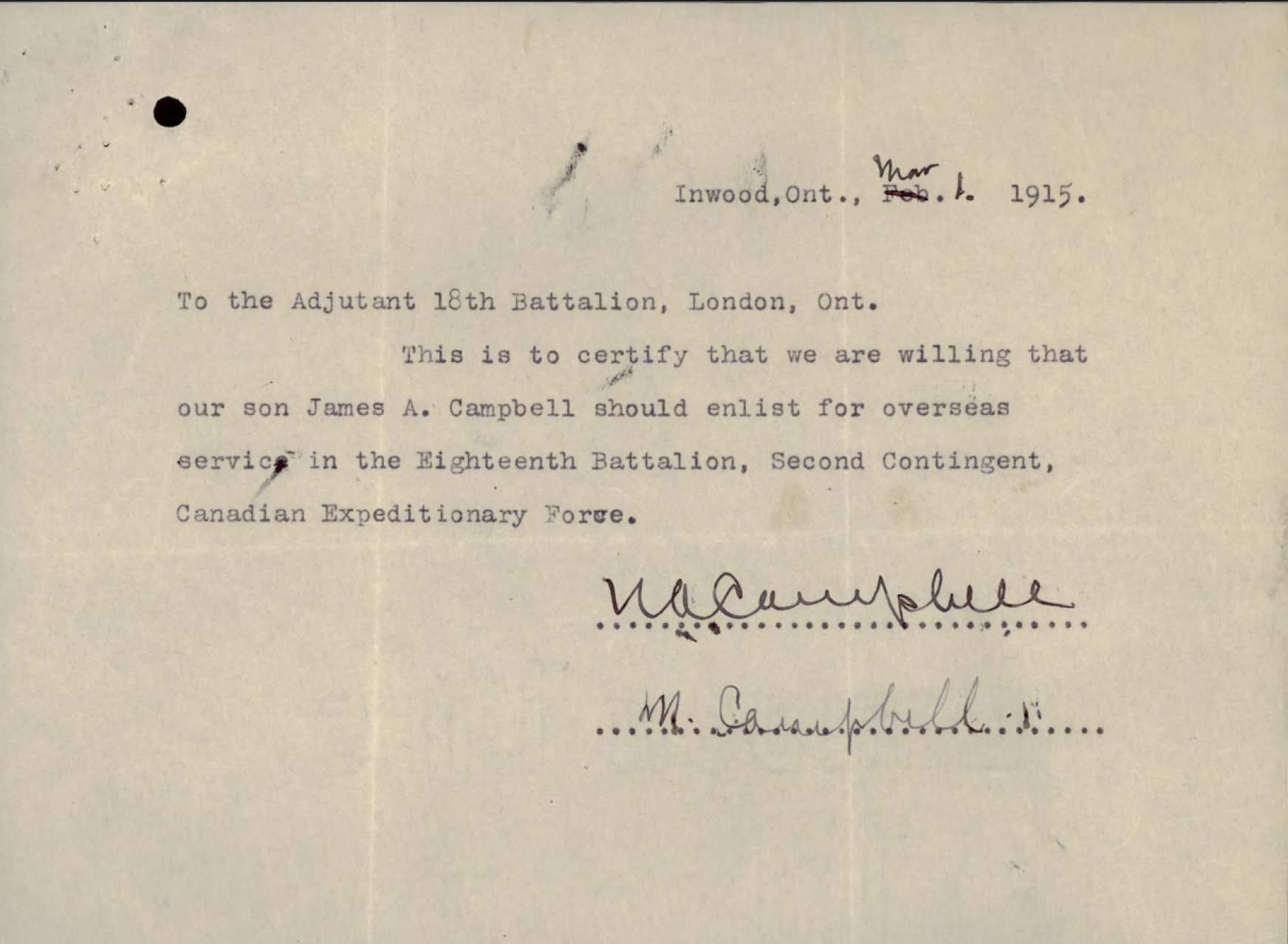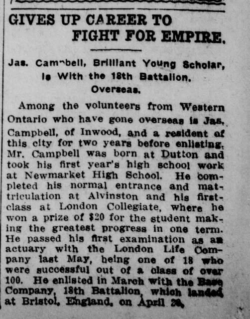 Family Search: When Private James Alva Campbell was born on 22 October 1895, in Dutton, Elgin, Ontario, Canada, his father, Neil Alexander Campbell, was 27 and his mother, Maribel Black, was 23. He married Carrie Elizabeth Beer on 24 September 1921, in London, Canada West, British North America. They were the parents of at least 2 sons. He lived in Elgin, Leeds and Grenville, Ontario, Canada in 1901 and Lambton, Ontario, Canada in 1911. He registered for military service in 1915. In 1915, at the age of 20, his occupation is listed as clerk. He died on 8 April 1973, at the age of 77, and was buried in Woodland Cemetery, London, Ontario, Canada.