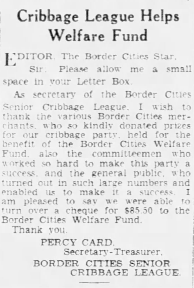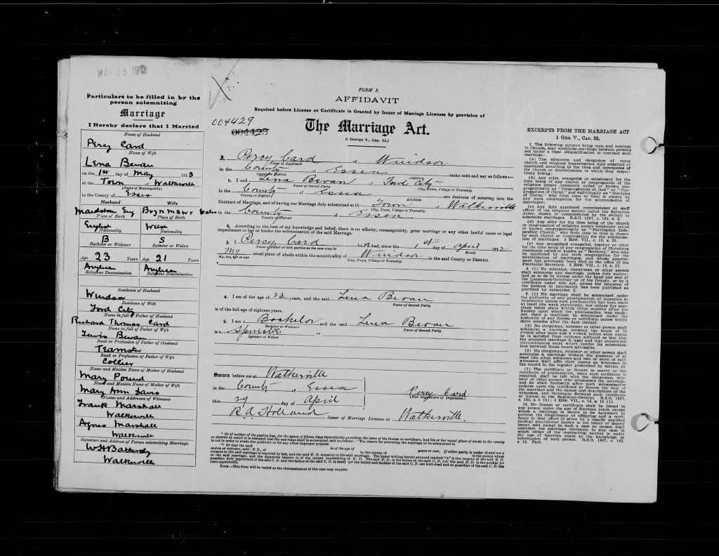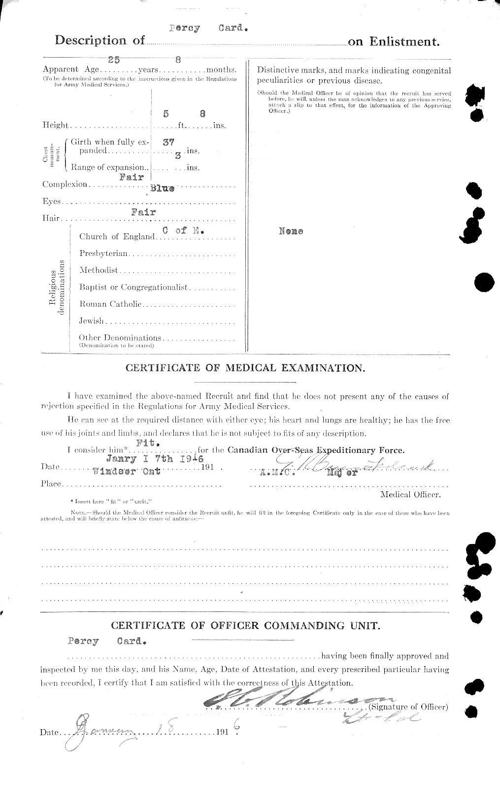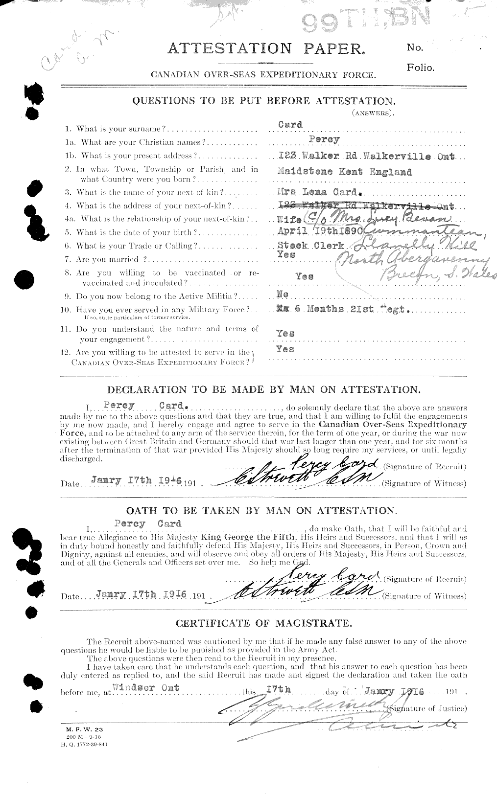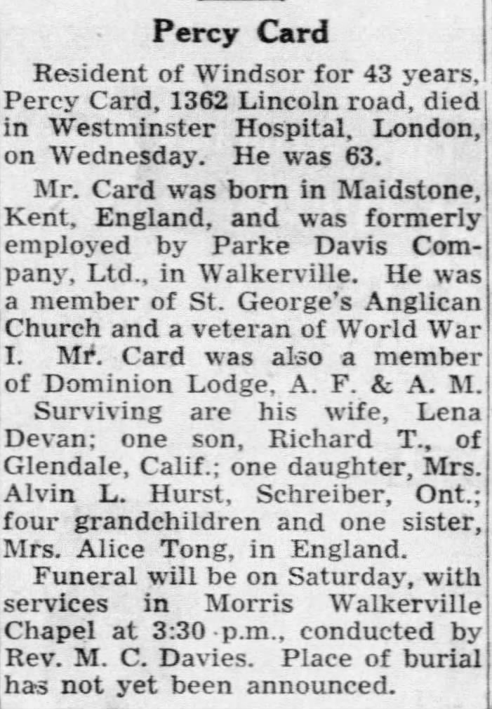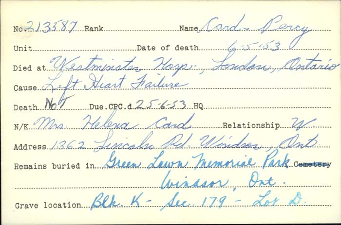 Family Search: When Lance-Corporal Percy Card was born on 19 April 1890, in Maidstone, Kent, England, United Kingdom, his father, Richard Thomas Card, was 35 and his mother, Mary Ann Pound, was 32. He married Helena Bevan on 1 May 1913, in Walkerville, Windsor, Essex, Ontario, Canada. They were the parents of at least 1 son and 2 daughters. He lived in Walkerville, Windsor, Essex, Ontario, Canada in 1916 and Windsor, Essex, Ontario, Canada in 1922. He registered for military service in 1916. In 1916, at the age of 26, his occupation is listed as store clerk in Walkerville, Windsor, Essex, Ontario, Canada. He died on 6 May 1953, in London, Ontario, Canada, at the age of 63, and was buried in Green Lawn Memorial Gardens, Oldcastle, Tecumseh, Essex, Ontario, Canada.