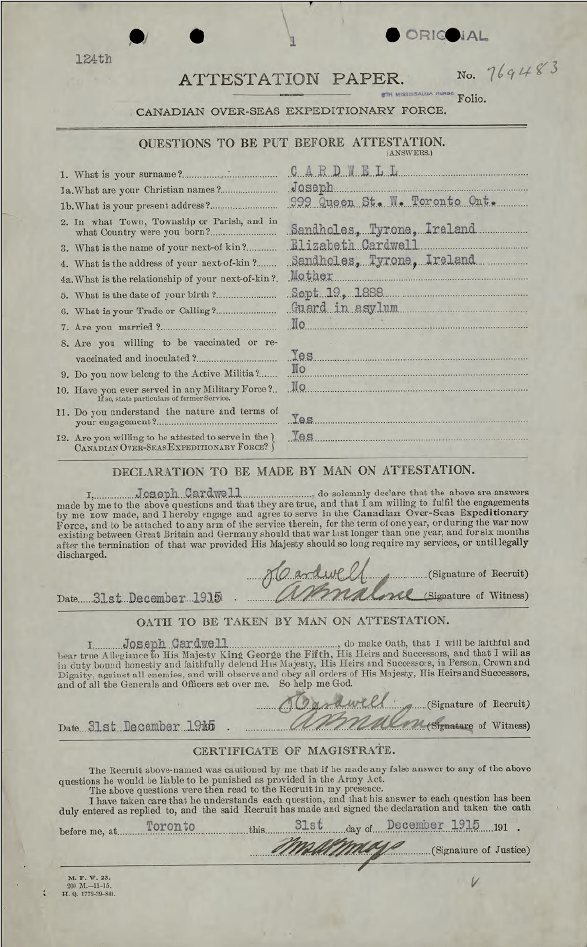Family Search: When Private Joseph Cardwell was born on 19 September 1887, in Sandholes, County Tyrone, Ireland, his father, Robert Cardwell, was 34 and his mother, Elizabeth Black Cardwell, was 37. He married Hester Cathcart Steen on 11 October 1920, in York, Toronto, Ontario, Canada. He lived in Gortfad, County Tyrone, Ireland in 1911. He died on 30 August 1939, in Toronto, York, Ontario, Canada, at the age of 51, and was buried in Park Lawn Cemetery, Toronto, Ontario, Canada.