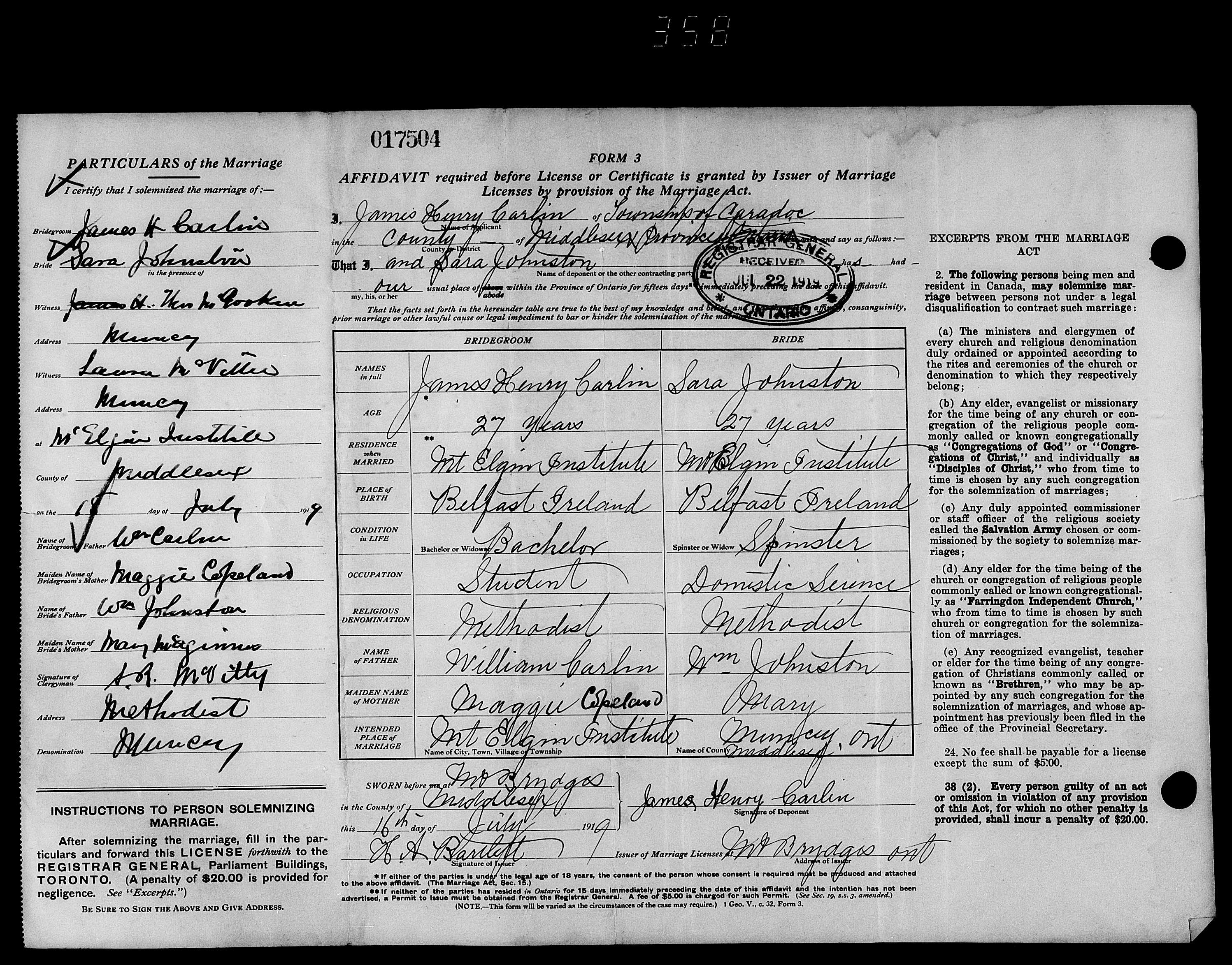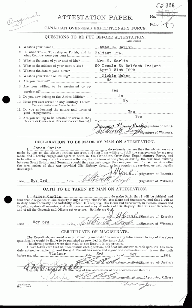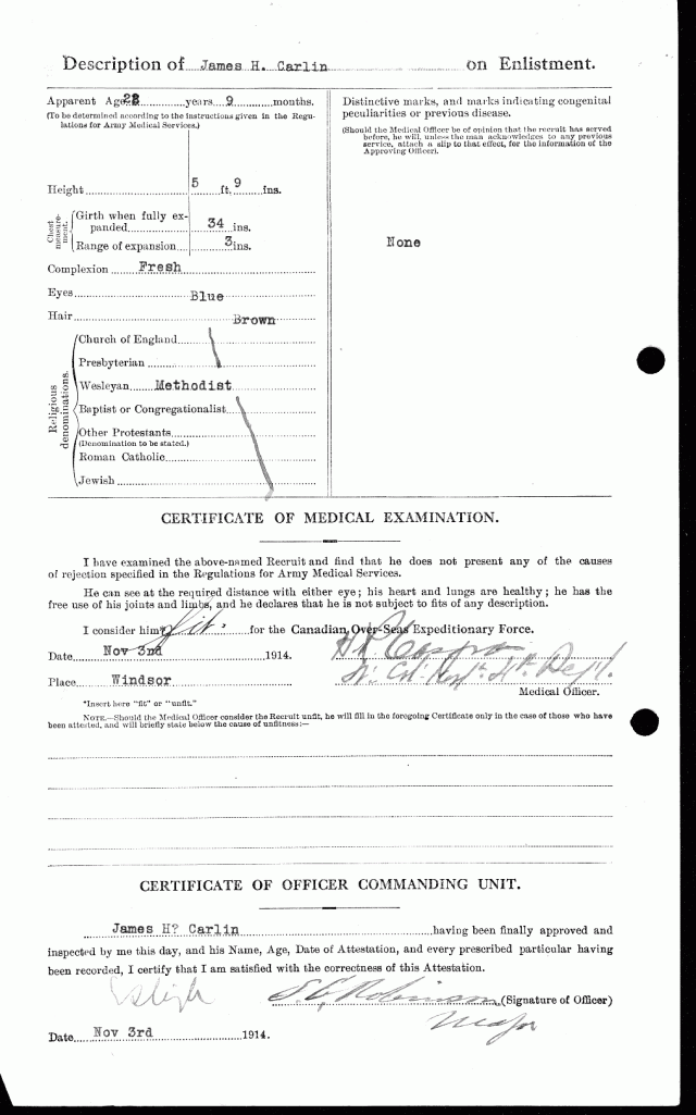 Family Search: Private James Henry Carlin was born on 21 April 1892, in Belfast, Ireland as the son of William Carlin and Maggie Copeland. He married Sara Johnston on 18 July 1919, in Mount Elgin, Oxford, Ontario, Canada. He immigrated to Canada in 1913 and lived in Street, County Longford, Ireland in 1911 and Brandon, Manitoba, Canada in 1931. He registered for military service in 1914. In 1925, at the age of 33, his occupation is listed as minister in Manitoba, Canada.