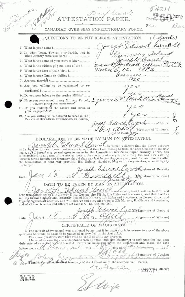 Joseph emigrated to Canada in 1912 and was a farmer in the Springfield area when he enlisted for service on January 18, 1915 in St. Thomas. He had served two years with the 2nd Battalion of Royal Guernsey Militia. He served with the 18th Battalion C.E.F.