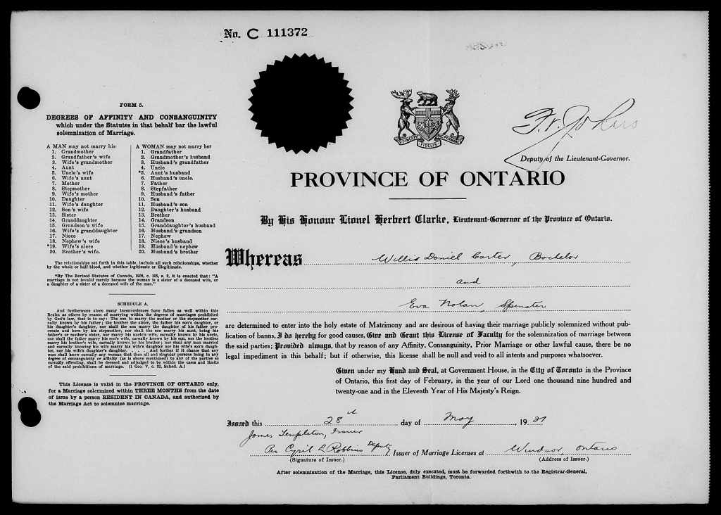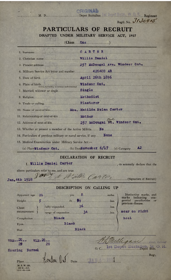 Family Search: When Private Daniel Willis Jespers Carter was born on 26 April 1896, in Windsor, Essex, Ontario, Canada, his father, James Robert Carter, was 27 and his mother, Matilda Jean Chambers, was 23. He had at least 3 sons and 3 daughters with Mable Eva Nolan. He lived in Windsor, Essex, Canada West, British Colonial America in 1918 and Sandwich West Township, Essex, Ontario, Canada in 1931. He registered for military service in 1918. In 1918, at the age of 22, his occupation is listed as plasterer in Windsor, Sandwich Township, Essex, Ontario, Canada. He died on 15 August 1964, in Windsor, Essex, Ontario, Canada, at the age of 68, and was buried in Victoria Memorial Gardens, Oldcastle, Tecumseh, Essex, Ontario, Canada.