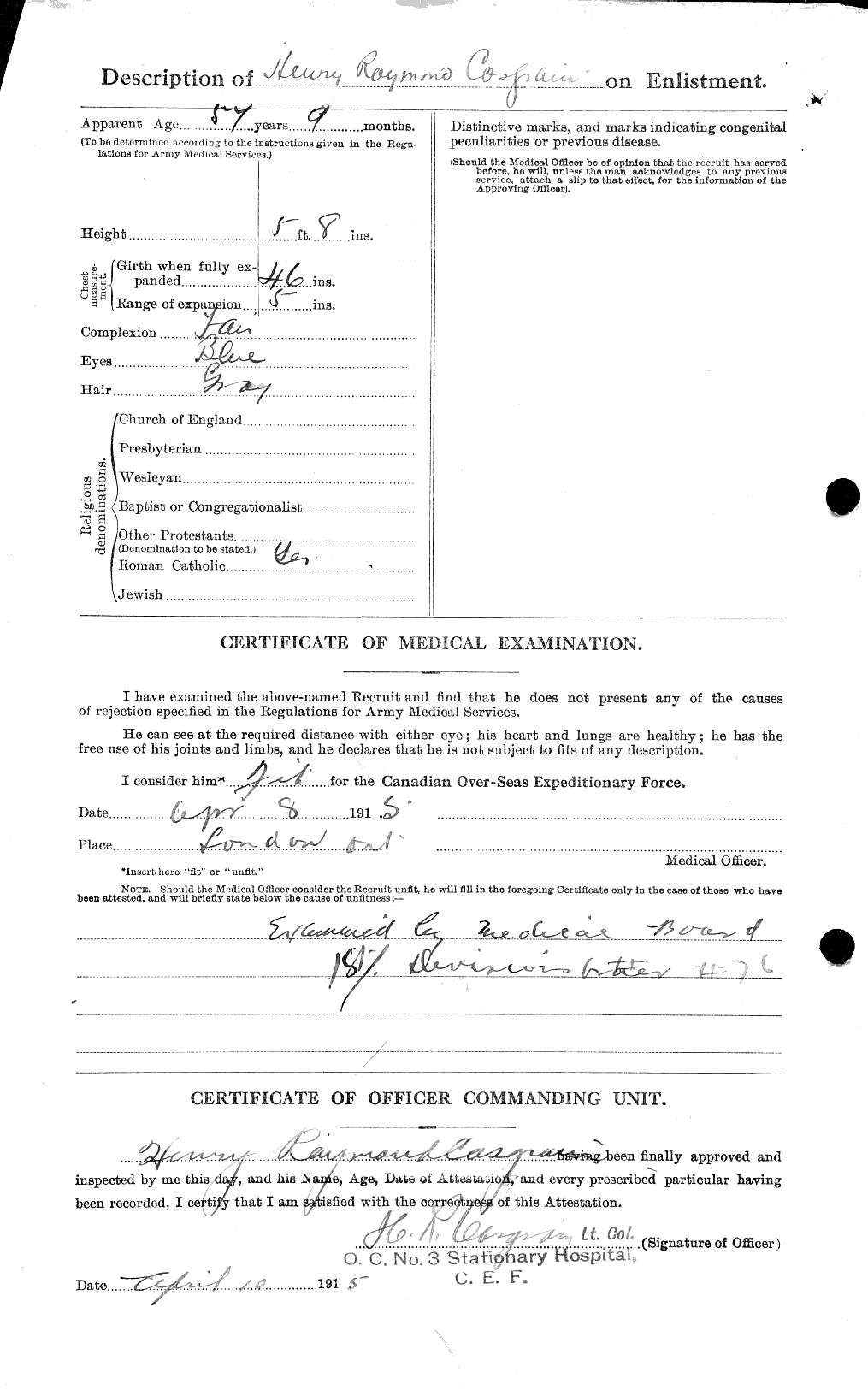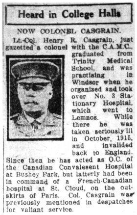His wife, Nursing Sister Alice Fraser Casgrain served in Canadian Army Medical Corps. Service records at this link.