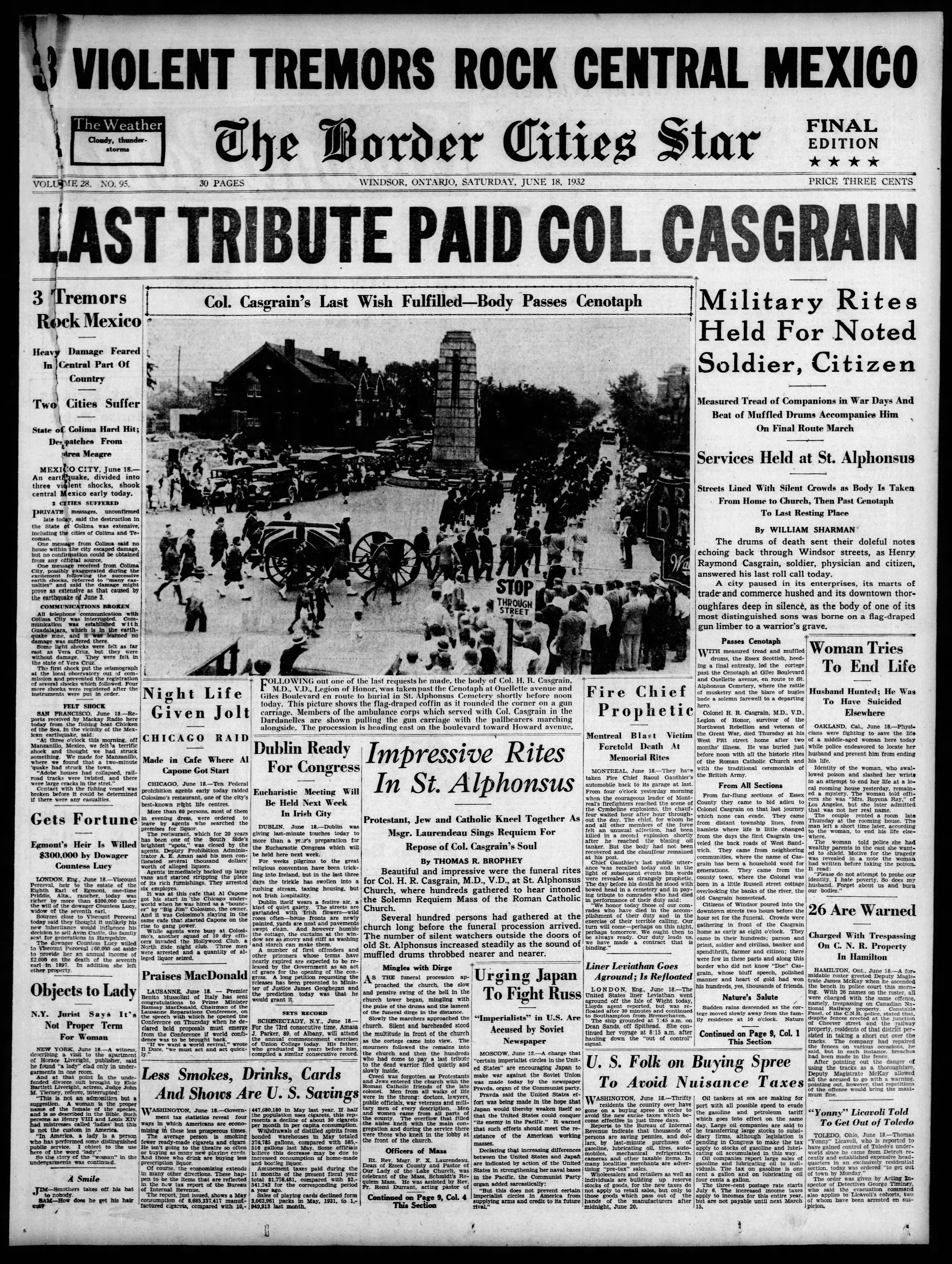 Family Search: When Dr. Henry Raymond Casgrain was born on 7 July 1857, in Sandwich, Essex, Ontario, Canada, his father, Sen. Charles Eusebe Casgrain, was 31 and his mother, Charlotte Marie Chase, was 26. He married Alice Meade Fraser on 18 February 1892, in Detroit, Wayne, Michigan, United States. He lived in Windsor, Sandwich, Essex, Ontario, Canada for about 8 years. He registered for military service in 1915. He died on 16 June 1932, in Windsor, Essex, Ontario, Canada, at the age of 74, and was buried in Saint Alphonsus Cemetery, Windsor, Essex, Ontario, Canada.