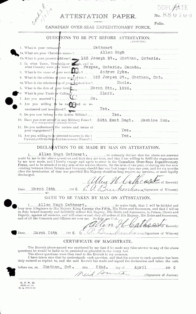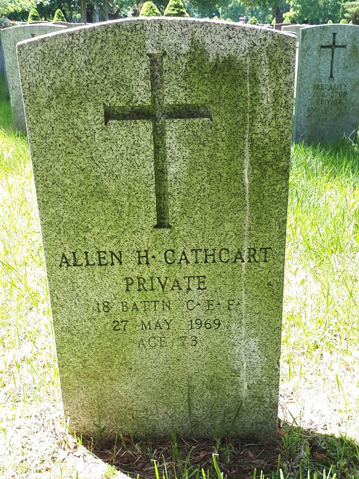 Family Search: Allen Hugh Cathcart was born on 5 March 1896, in Fergus, Wellington, Ontario, Canada as the son of Wesley John Cathcart and Susan Hoyce. He lived in Chatham, Chatham-Kent, Ontario, Canada in 1930. He registered for military service in 1916. In 1916, at the age of 20, his occupation is listed as clerk. He died on 27 May 1969, in London, Ontario, Canada, at the age of 73, and was buried in Woodland Cemetery, London, Ontario, Canada.
