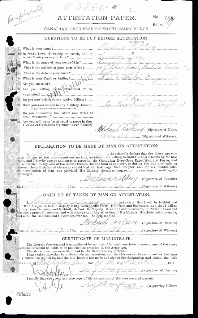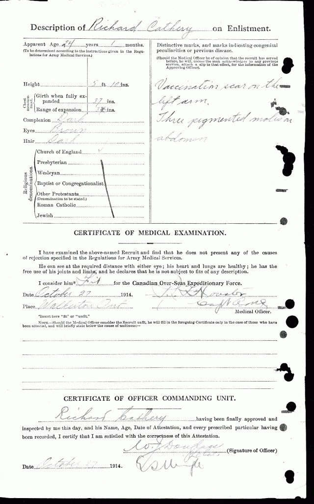 Family Search: Private Richard Cathery was born on 21 September 1890, in London, England, United Kingdom as the son of Fanny Cathery. He had at least 1 daughter with Grace Ellen Russell. He immigrated to Canada in 1913. He registered for military service in 1914. In 1914, at the age of 24, his occupation is listed as gas motor engineer. He died on 14 January 1959, in Montreal, Quebec, Canada, at the age of 68, and was buried in Cimetière Mont-Royal, Outremont, Montreal, Quebec, Canada.