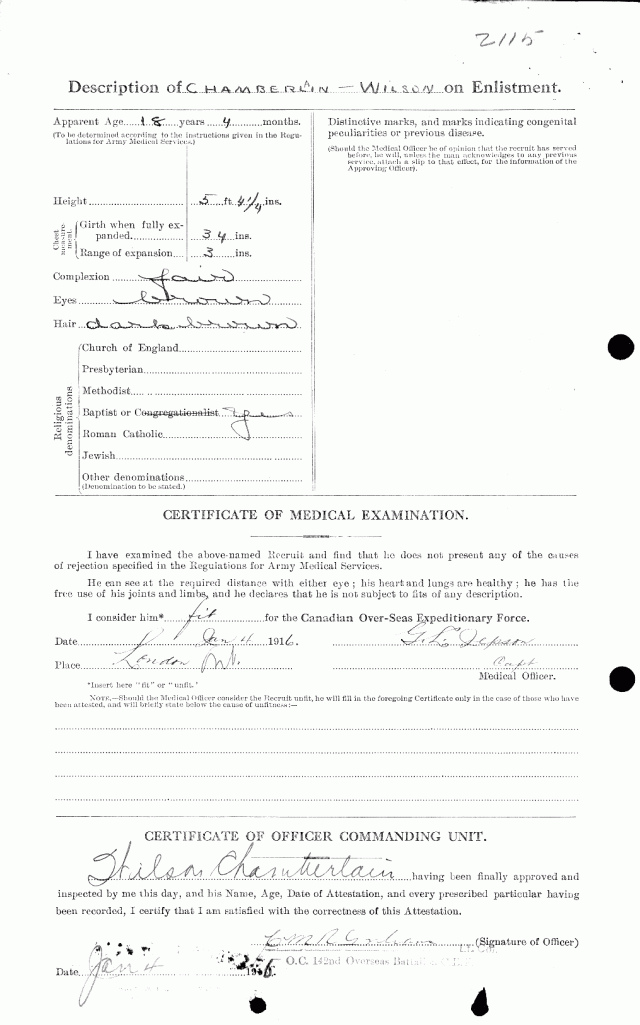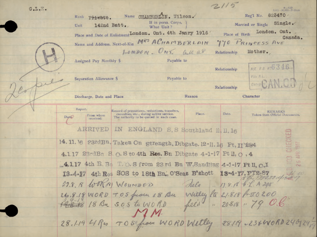 This man enlisted with the 142nd Battalion CEF on 4 January 1916 at London, Ontario and was assigned the regimental number of 823470.