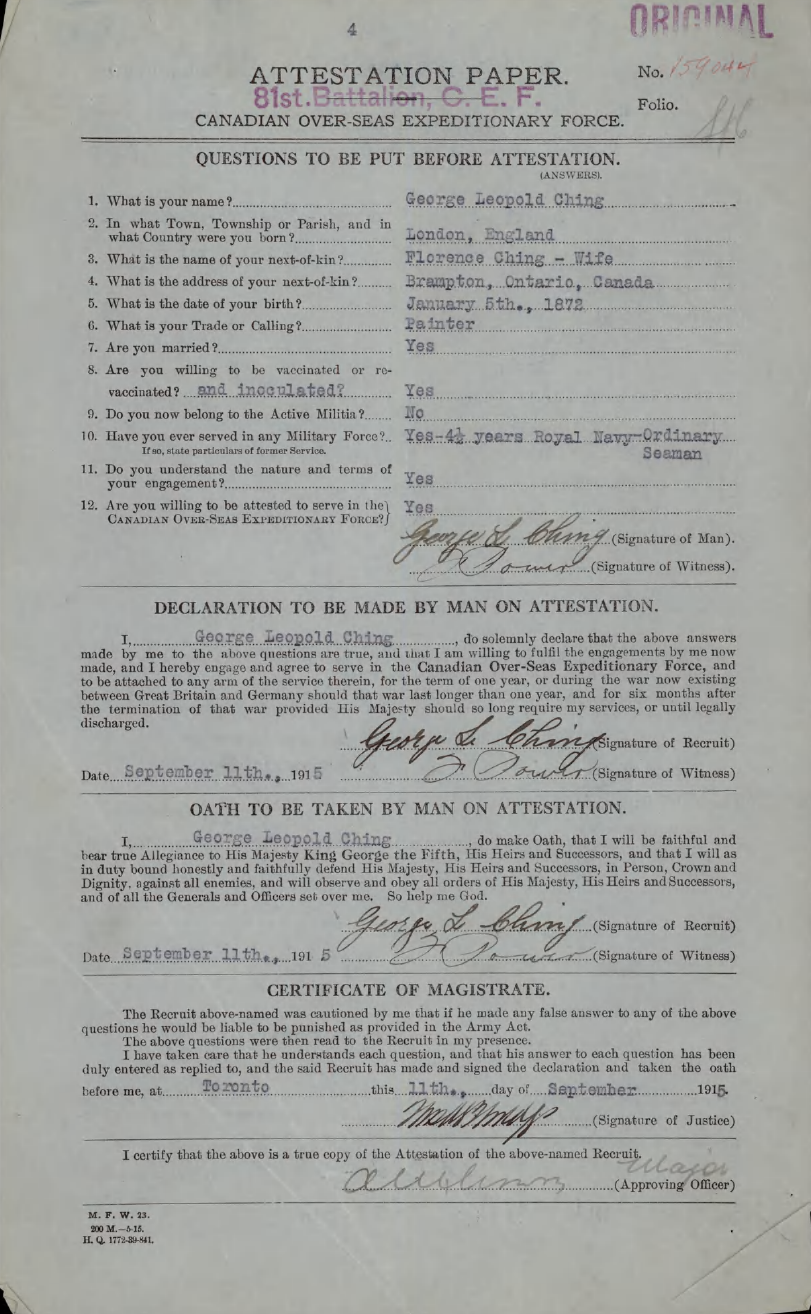 This man enlisted with the 81st Battalion on 11 September 1915, at Toronto, Ontario. He was a painter and decorator with 4.5 years as an Able Seaman with the Royal Navy.
