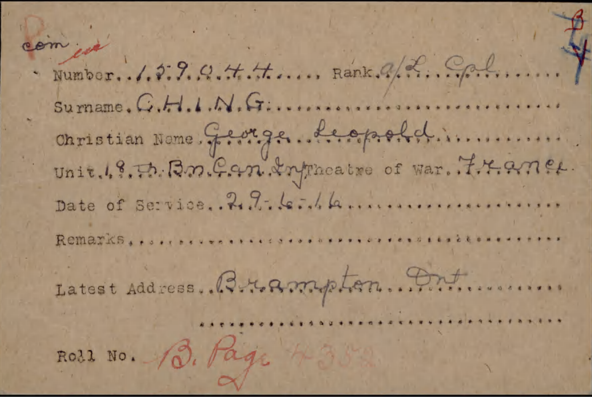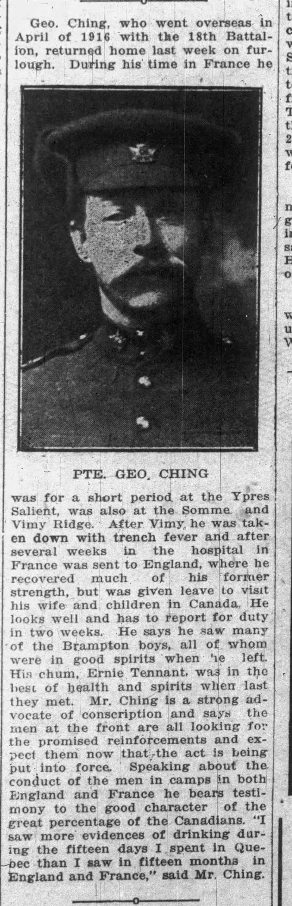 Private Ching was then attached to 4th Field Company, Canadian Engineers on 19 October 1916, returning on 12 November 1916.