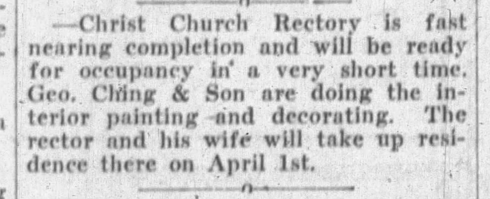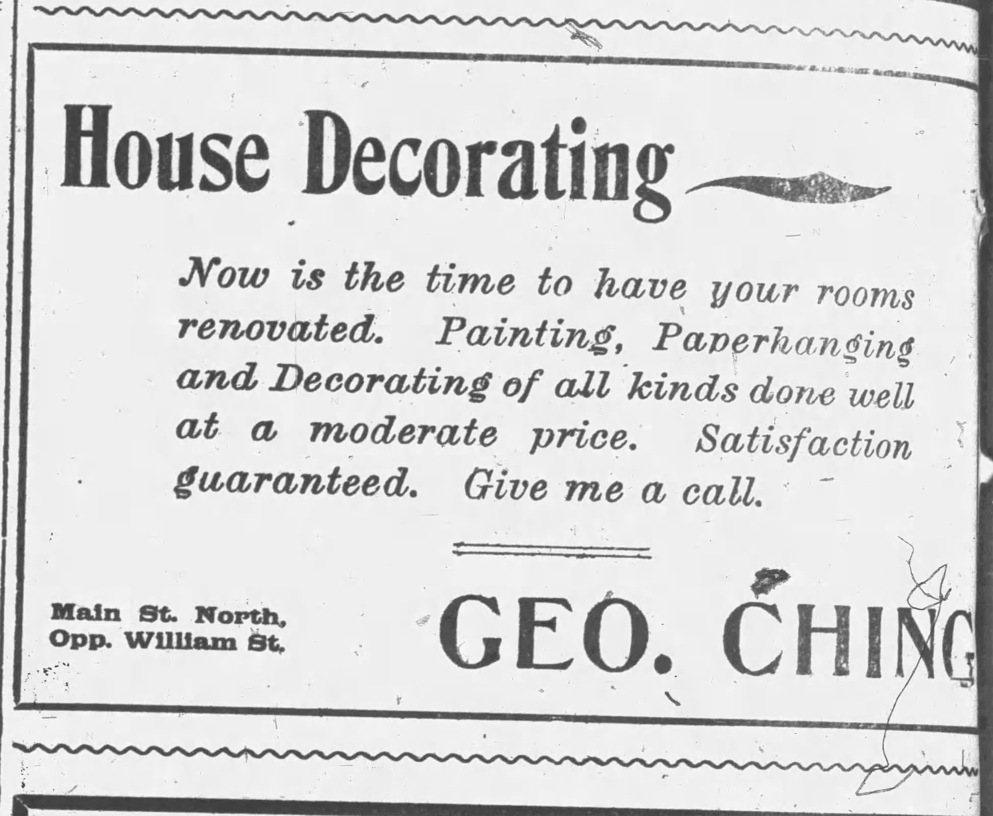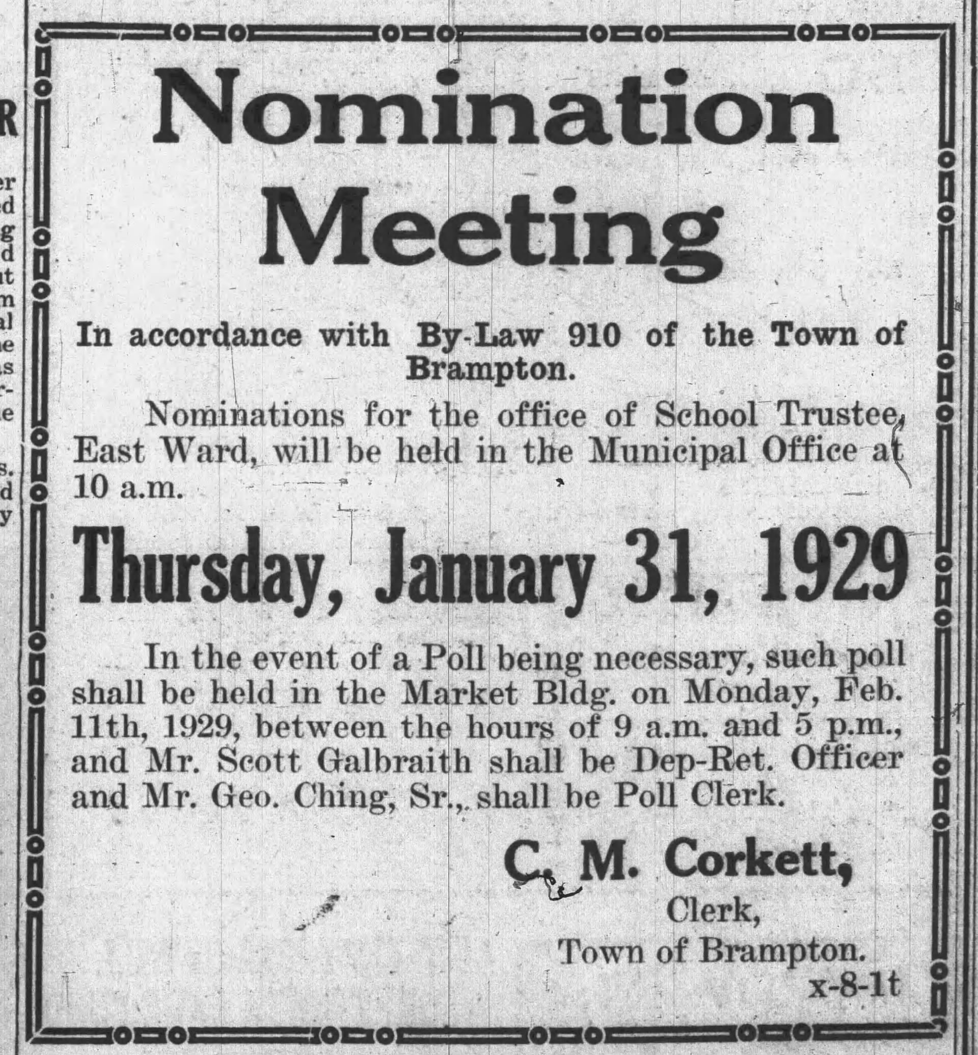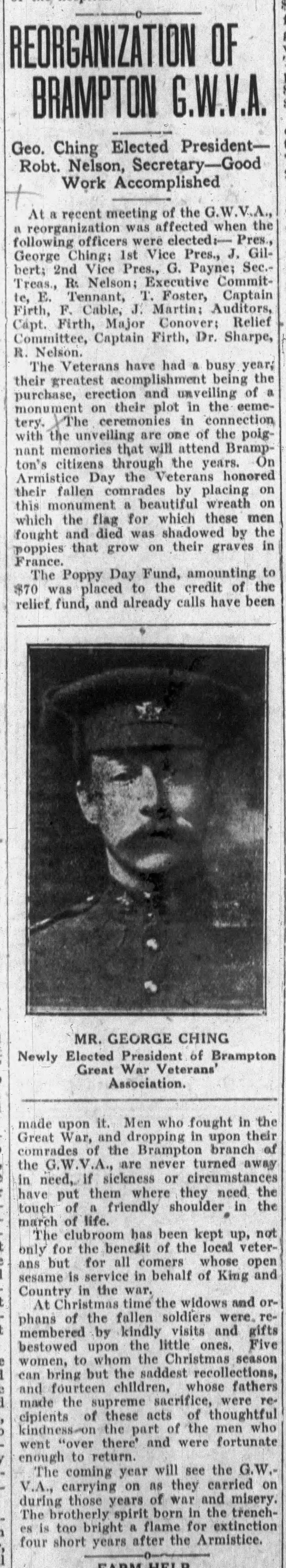 George Leopold Ching, a resident of Brampton since 1906, died at his residence on Thursday afternoon after an illness of five years. Mr. Ching was born in London, England, in 1872, and outside of his immediate family had no living relatives. He was a painter and decorator by trade. On September 15, 1915, he enlisted and saw service overseas in France. He was discharged on October 17, 1917. At one time he was active in the Brampton branch of the Canadian Legion and in the Lions Club. He was a member of Christ Church of England, Brampton. Surviving are his wife, formerly Miss Florence Cross, two sons, Sgt. George Ching, Chorley Park, Toronto, and Sgt. Major Edward Ching, serving overseas, and two daughters, Mrs. Charles Smith, Toronto, and Miss Rose Ching, at home. There are seven grandchildren. Funeral services were held from the residence, 170 Queen east, on Saturday afternoon and interment was in Brampton cemetery. Rev. Canon R. W. Allen, rector of Christ Church, officiated. The pallbearers were Lieut.-Col. Corkett, Major Bertram, Messrs. T. H. Moorehead, Ted Vokes, Ernest Tennant, and James Richardson. The floral tributes were many and beautiful.
