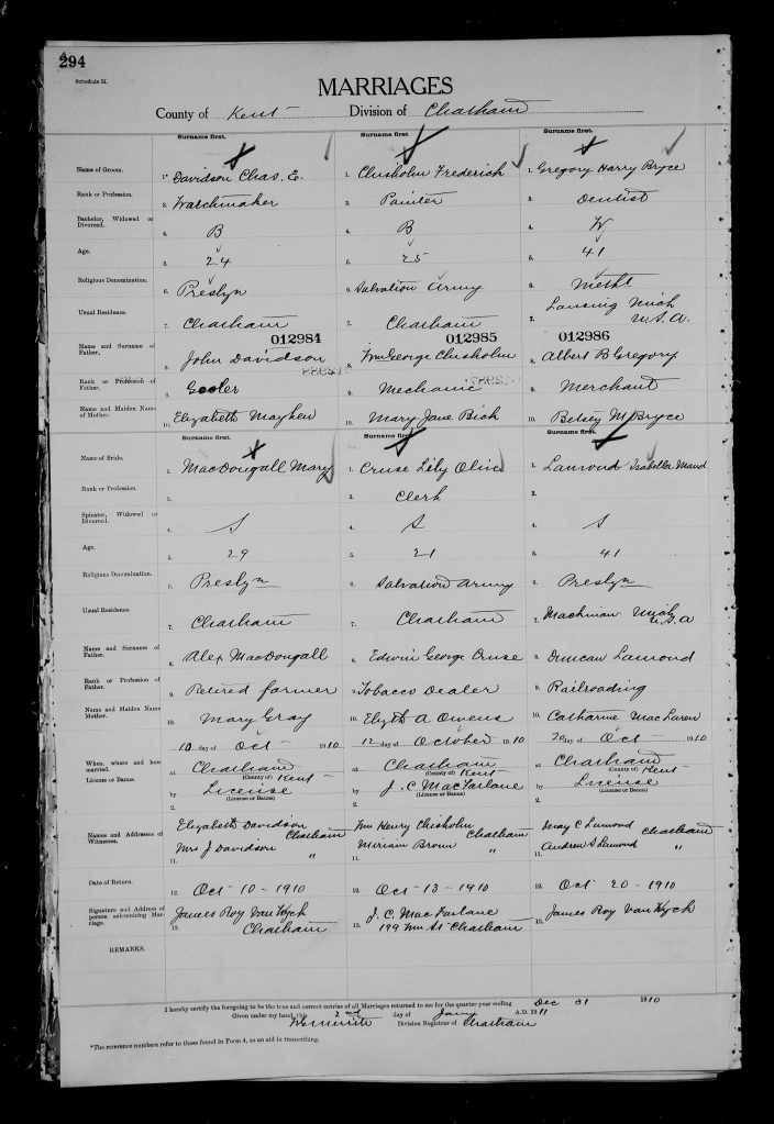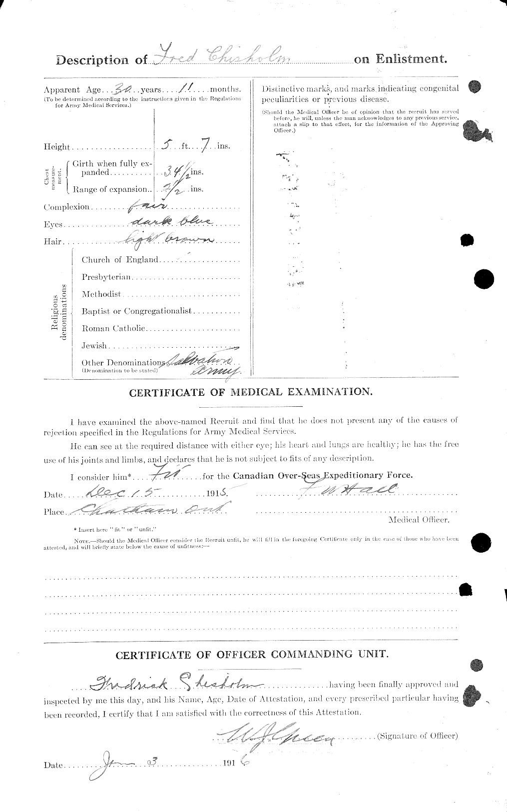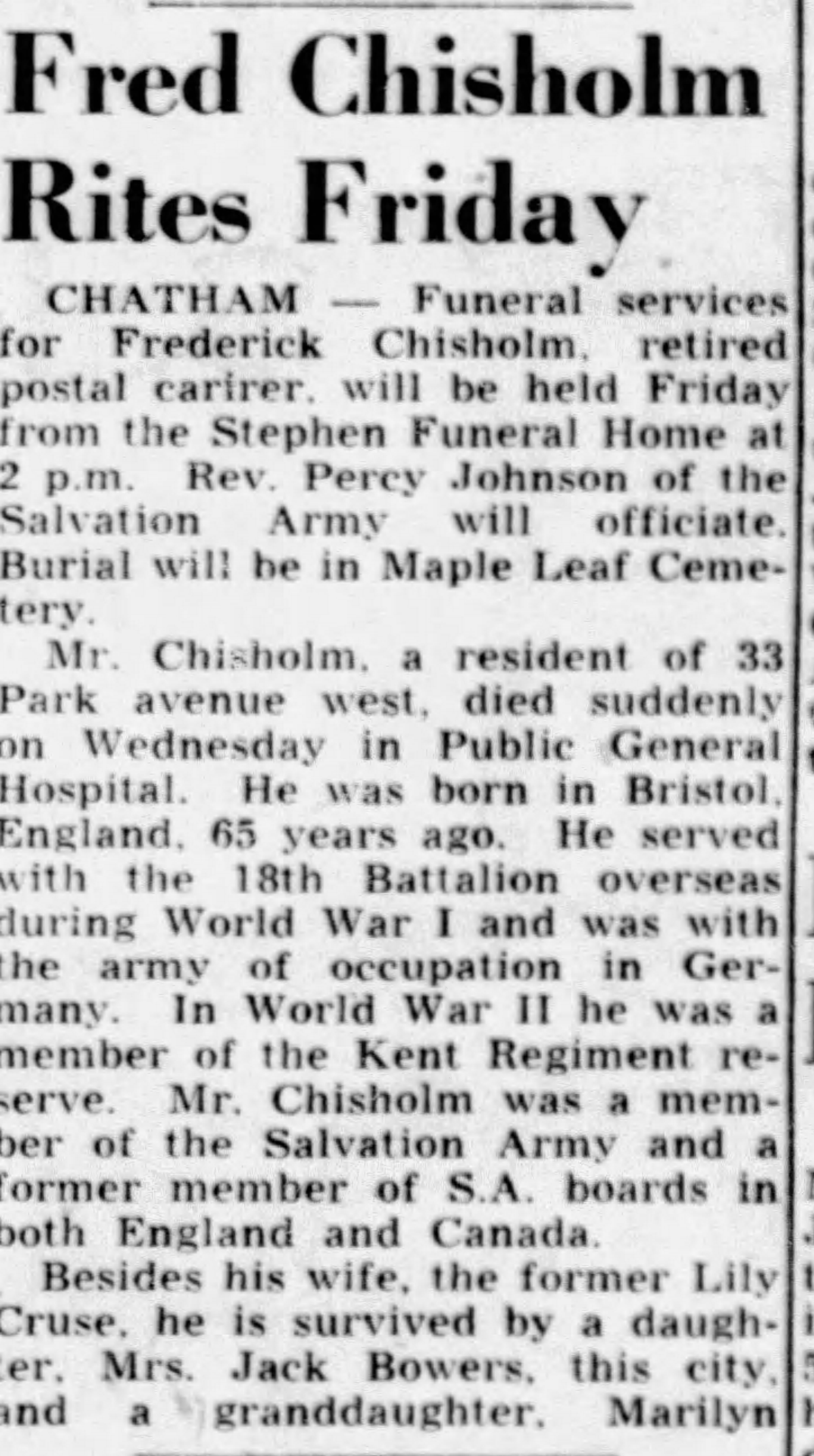 Family Search: When Private Frederick Chisholm was born on 3 February 1885, in Bristol, England, United Kingdom, his father, William George Chisholm, was 32 and his mother, Mary Jane Bick, was 31. He married Lilly Olive Cruse on 12 October 1910, in Chatham, Kent, Ontario, Canada. They were the parents of at least 1 daughter. He lived in Kent, Ontario, Canada in 1911. He registered for military service in 1916. He died on 20 December 1950, in Chatham, Kent, Ontario, Canada, at the age of 65, and was buried in Maple Leaf Cemetery, Chatham, Chatham-Kent, Ontario, Canada.