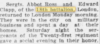 Sergts. Abbot Ross and Edward Clapp, of the 18th battalion, London, returned to London Monday Morning. They were in the city on military business and spent a day at their homes. Saturday night the sergeants of the Twenty-first regiment gave a social evening in their honor.