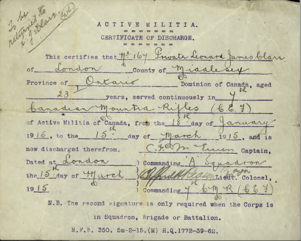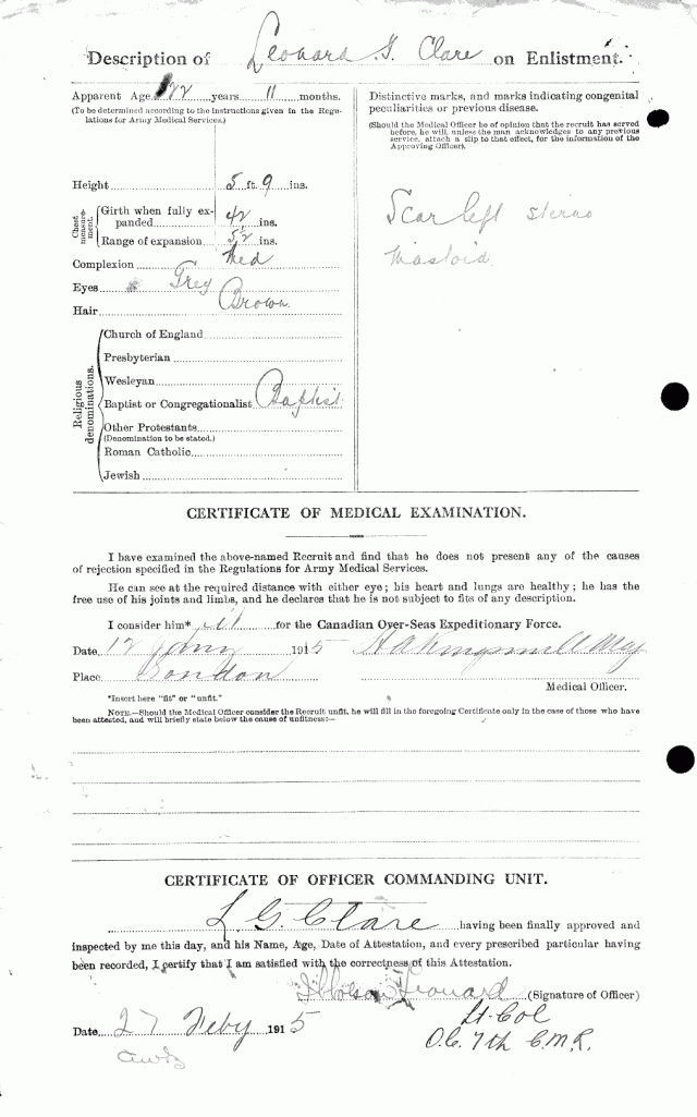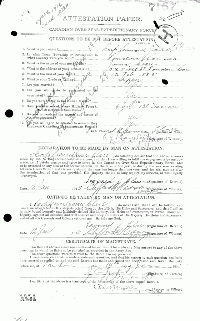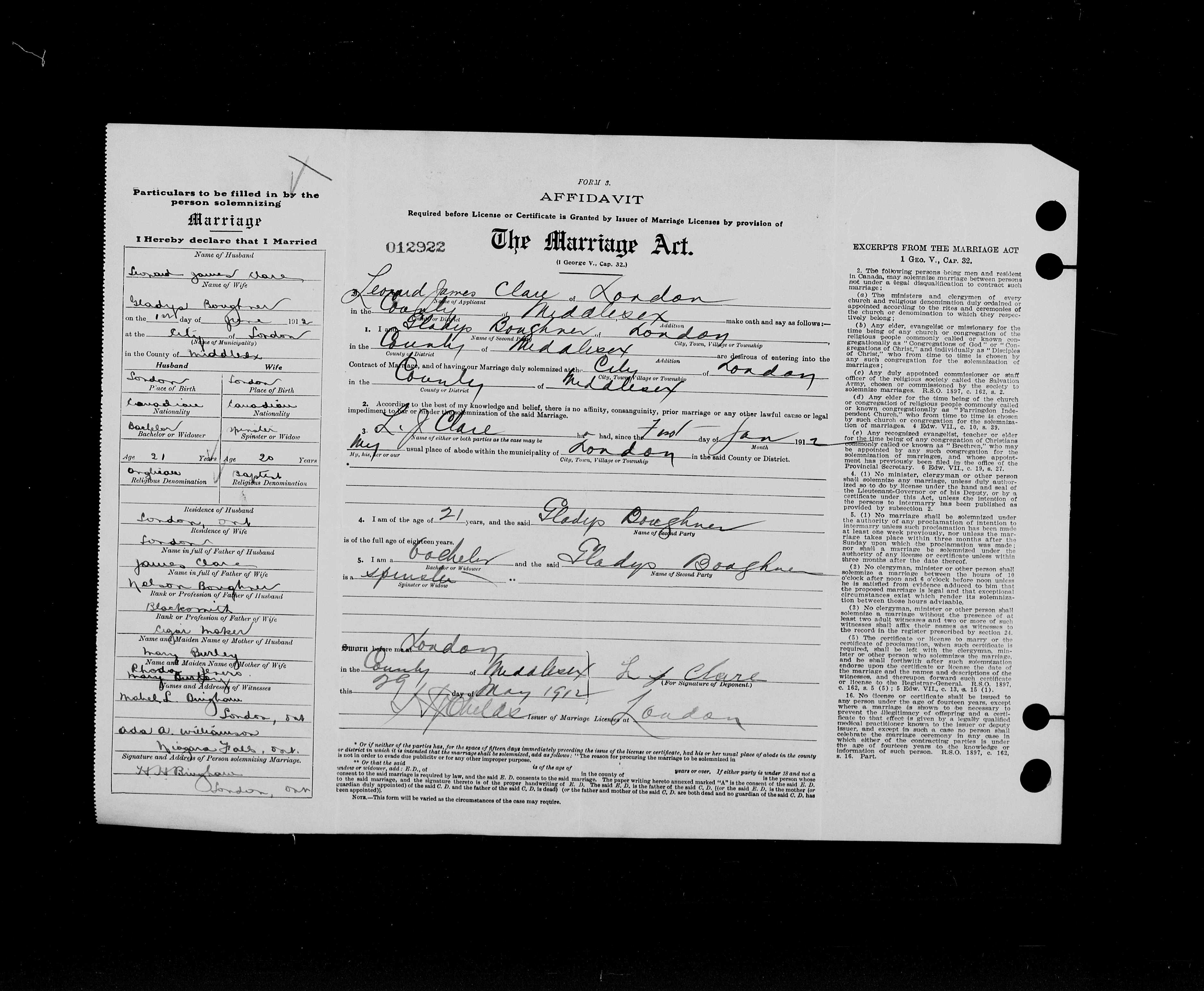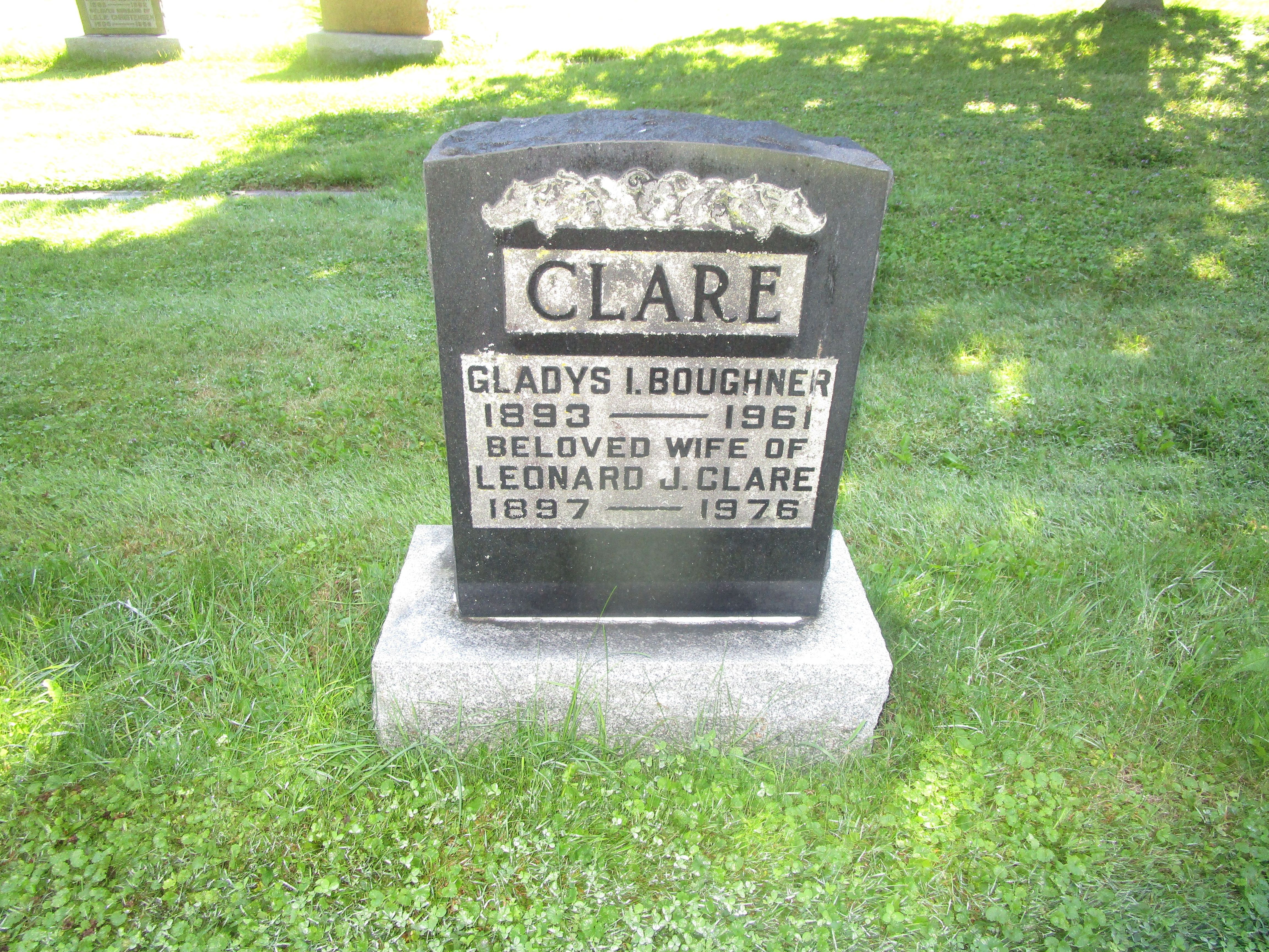 Family Search: When Leonard James Clare was born on 12 February 1893, in London, Ontario, Canada West, British Colonial America, his father, James Clare, was 38 and his mother, Mary Burleigh, was 27. He had at least 1 son and 3 daughters with Gladys Irene Boughner. He lived in London, Ontario, Canada for about 9 years. He registered for military service in 1915. In 1915, at the age of 22, his occupation is listed as shipper in London, Ontario, Canada. He died in 1976, at the age of 83, and was buried in Mount Pleasant Cemetery, West McGillivray, North Middlesex, Middlesex, Ontario, Canada.MORE
